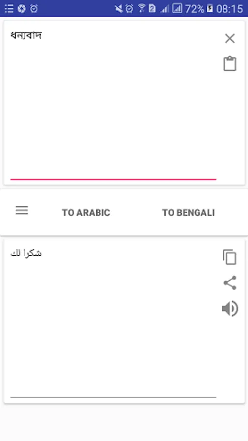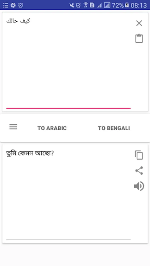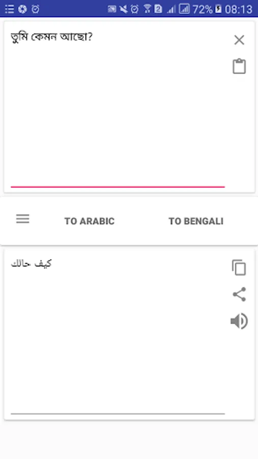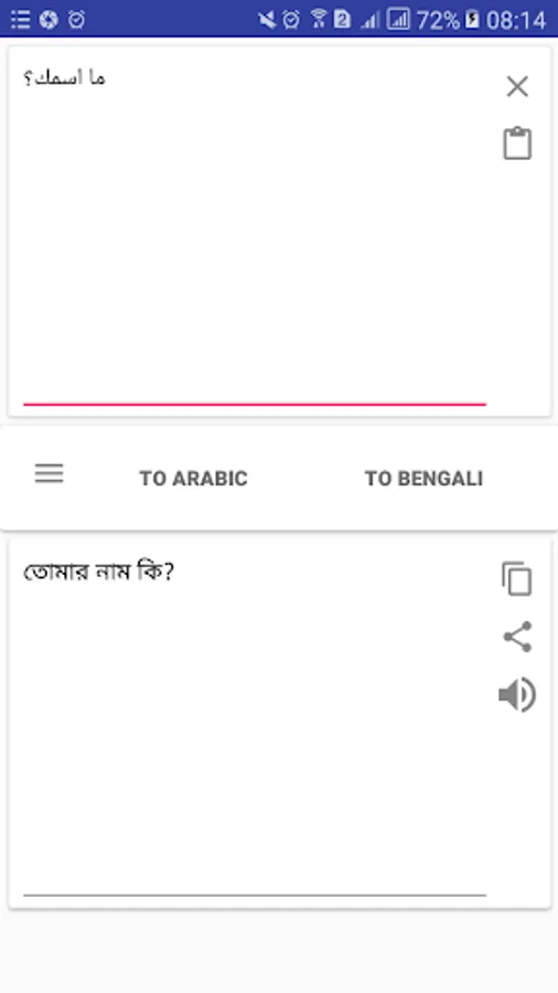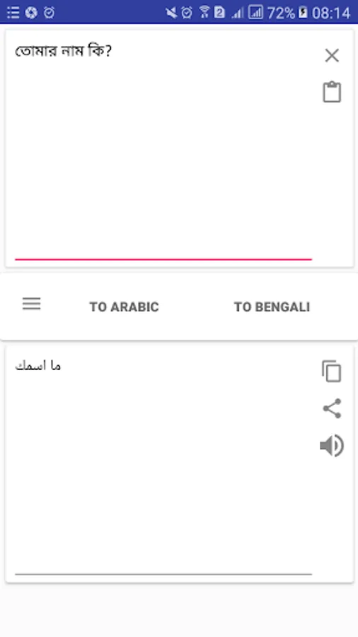 you can translate any sentence or phrase into from Bengali into Arabic or from Arabic into Bengali and you can listen the pronounciation.
