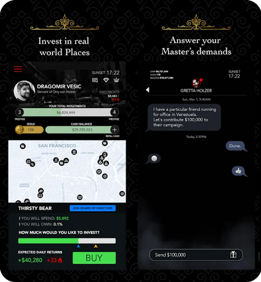 Your Vampire Master has given you one million in cash to start building an empire. Use it to invest in real-world points of interest near your GPS location. Keep the cash flowing as you help your Vampire get Lairs around the world, from humble mausoleums to opulent castles. What's in it for you? Get crazy rich so you can shop like a billionaire and put a golden toilet in your M5 sailing yacht.