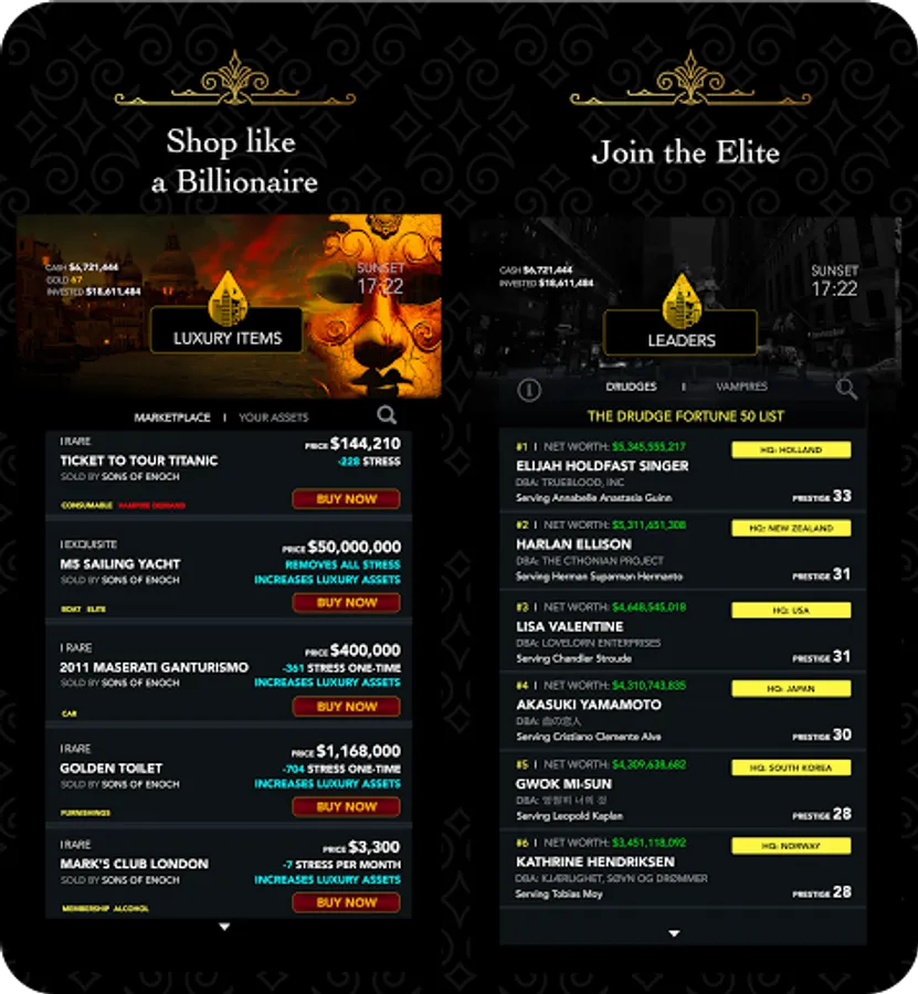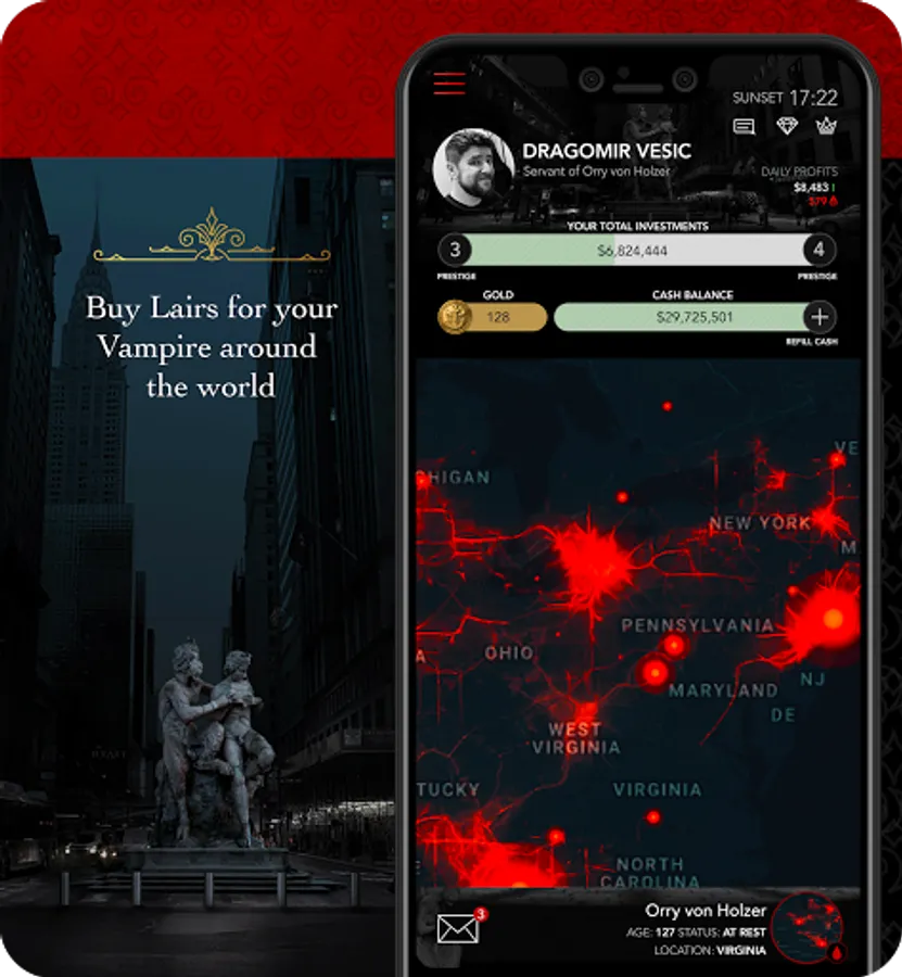 Build your empire alone or invite your friends to join a Secret Society of Vampire servants. Joining a society allows you to invest in your friends' locations and grow your empire even faster.