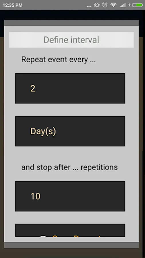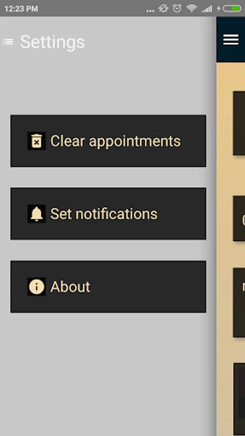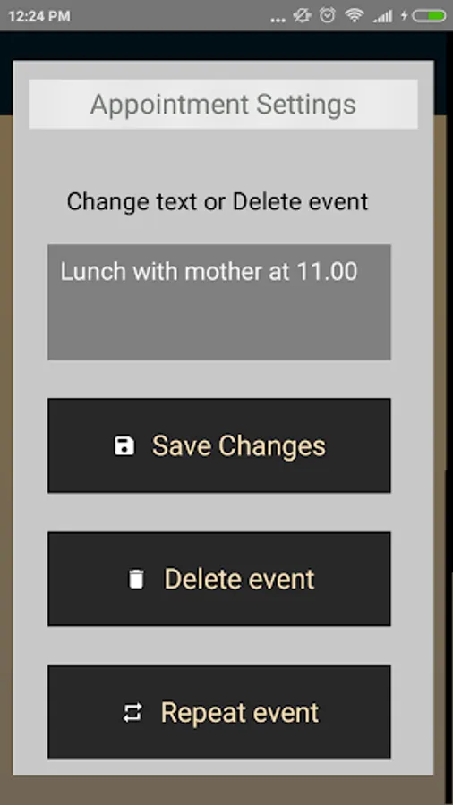 You can open the settings dialog by simply tapping on an appointment. The text field displays the current appointment, and you can edit and save the text or delete the entry entirely. Other available options are Repeat the Event (e.g. every 7 days), Set Notifications to show every minute, hour or day and to Clear the Entire Database of all the appointments (like a fresh start).