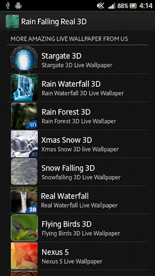 Now we created Another Amazing live wallpaper for you. Rain Falling 3D Live wallpaper is a Natural and Real. its a live and cool New Wallpaper for you Mobile Device And It Will Make Great Nature Feeling to you. If You are a Nature Lover. try it now.