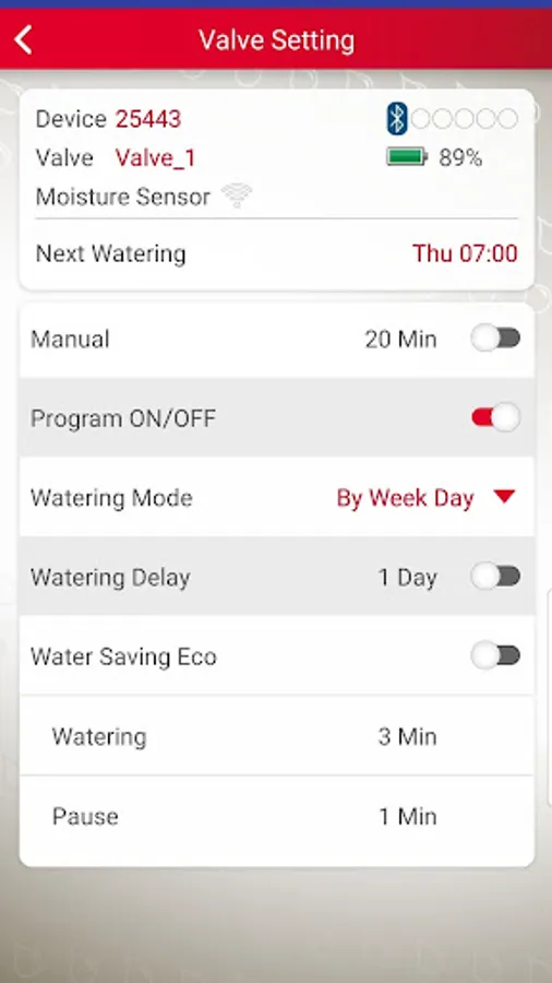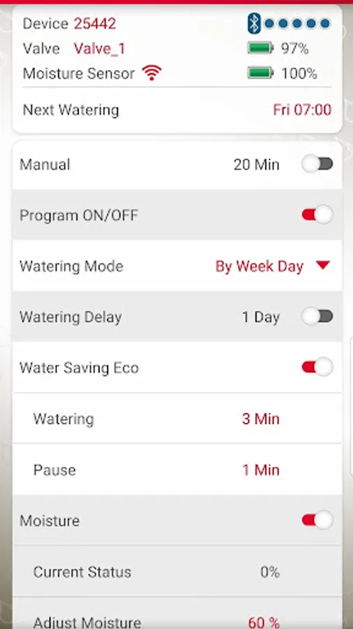 - Manual settings from the App is simple task (Manual watering in 1 minute increments up to 360 minutes)