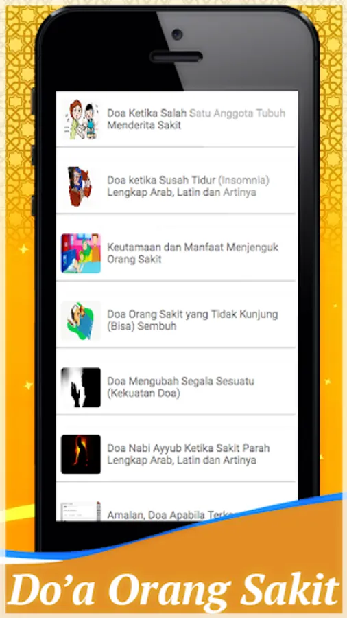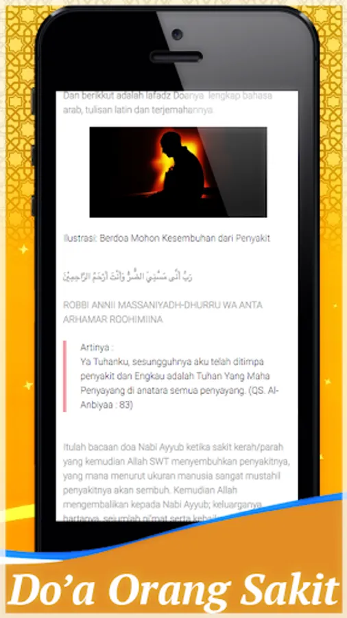 It is an application that contains the reading of Prayer for the Sick, Arabic, Latin and translation. In addition to going to the doctor and taking medication, people who are sick is recommended for the prayer to God, to immediately be healing. Maybe my friends during illness also often ask for healing (pray: O God, heal this servant disease, amen) or less so doanya.Tapi friends know? prayers more afdhol is a prayer in Arabic. And it turns out, there are special prayers for people who are sick.