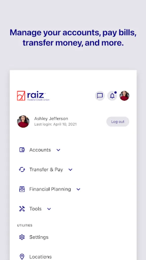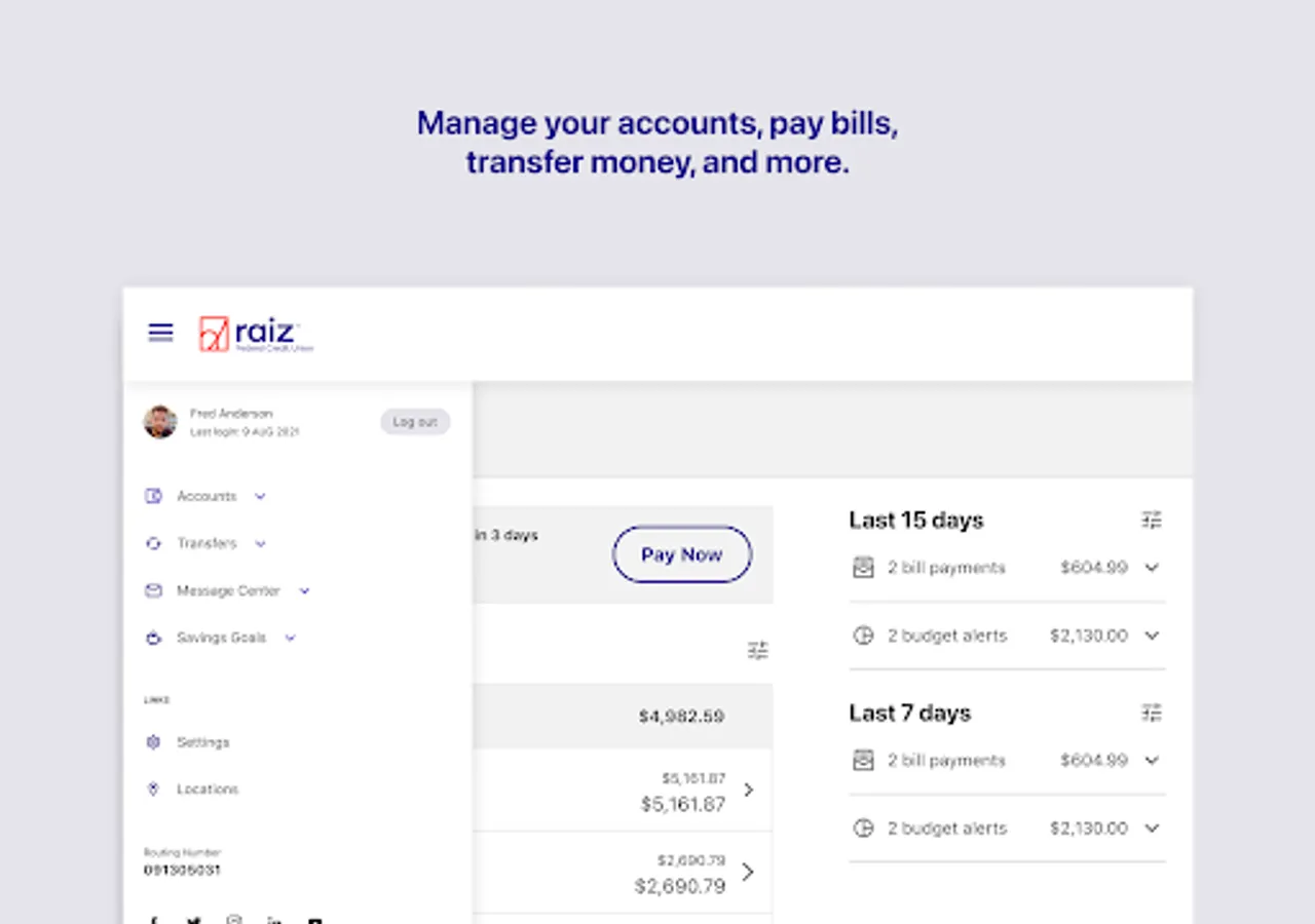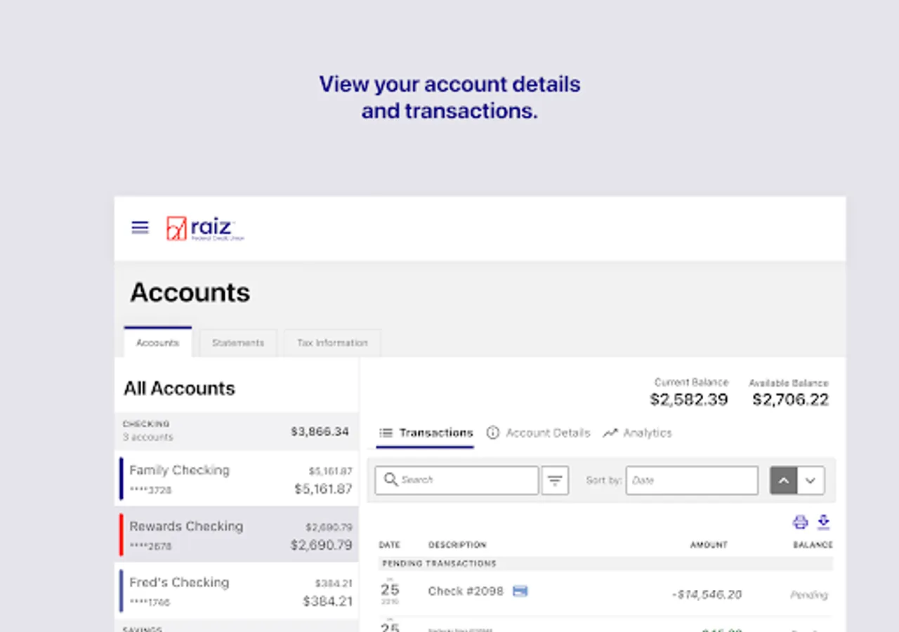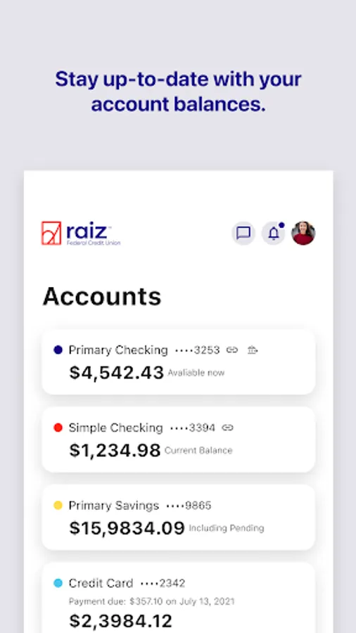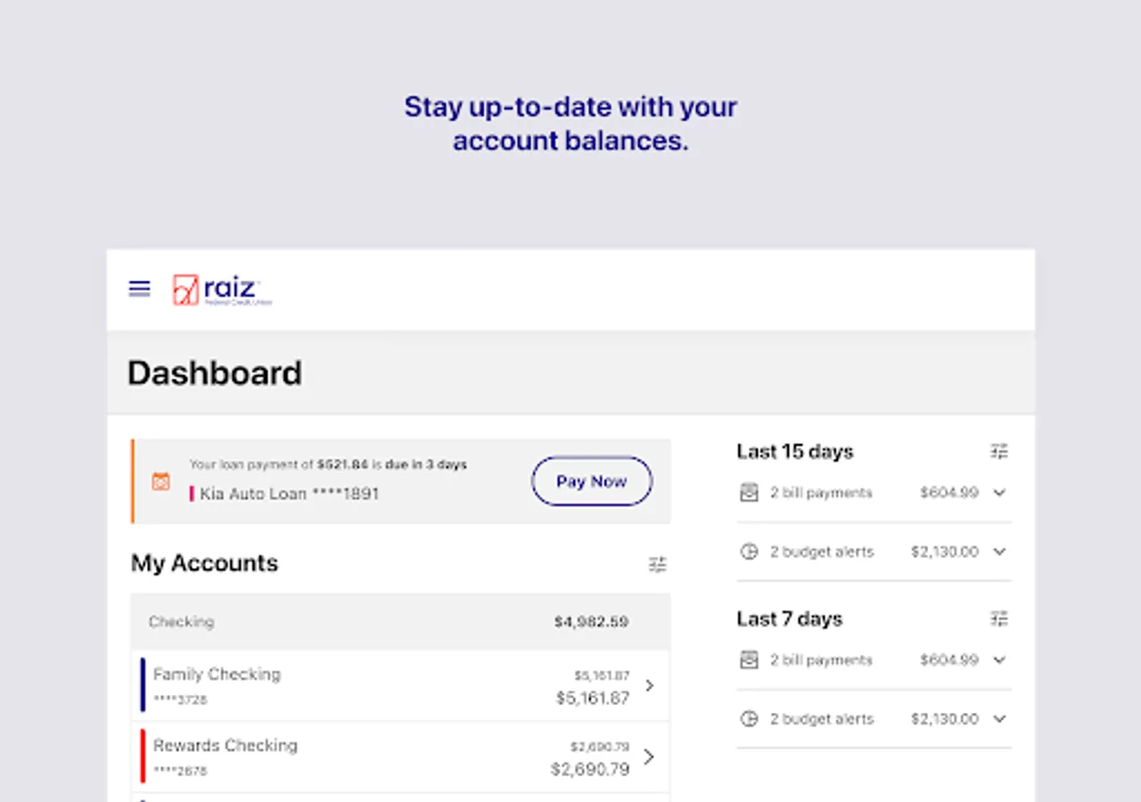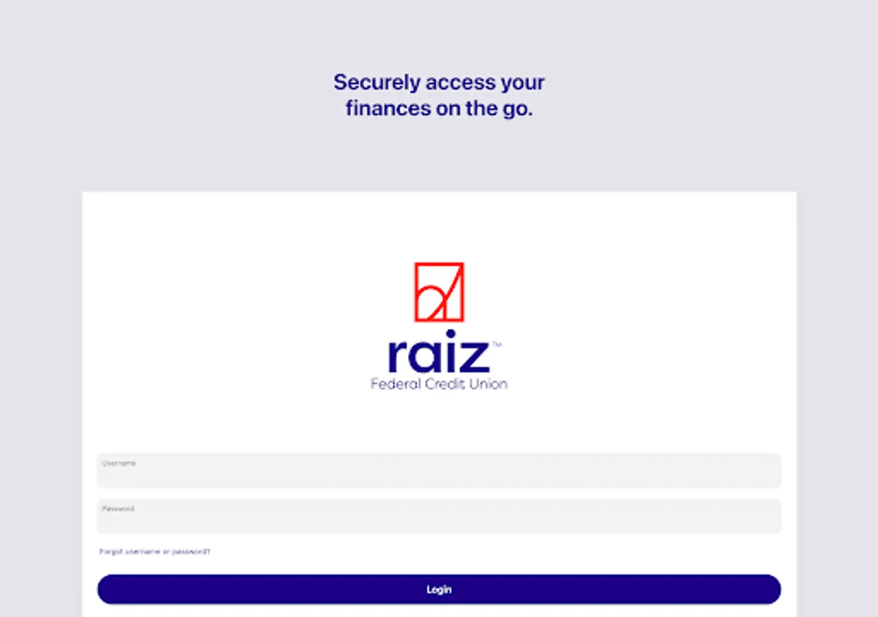 Our modern design and features allow intuitive navigation and account management. The Raiz mobile app is your all-in-one place for banking on the go. With our app, you can open new accounts, apply for loans, receive statements, view your credit score, manage your cards, and much more.