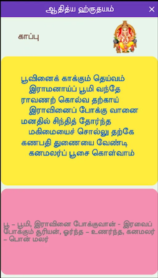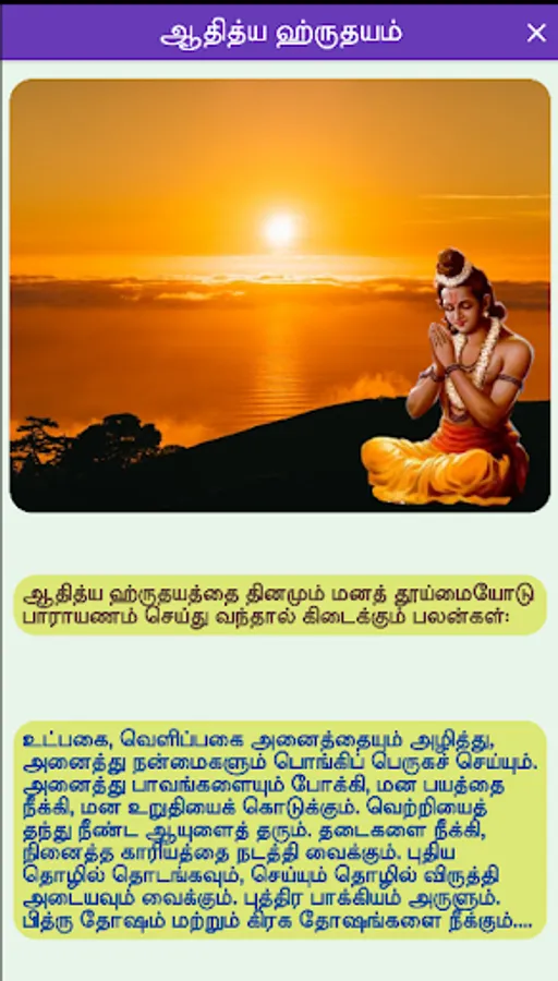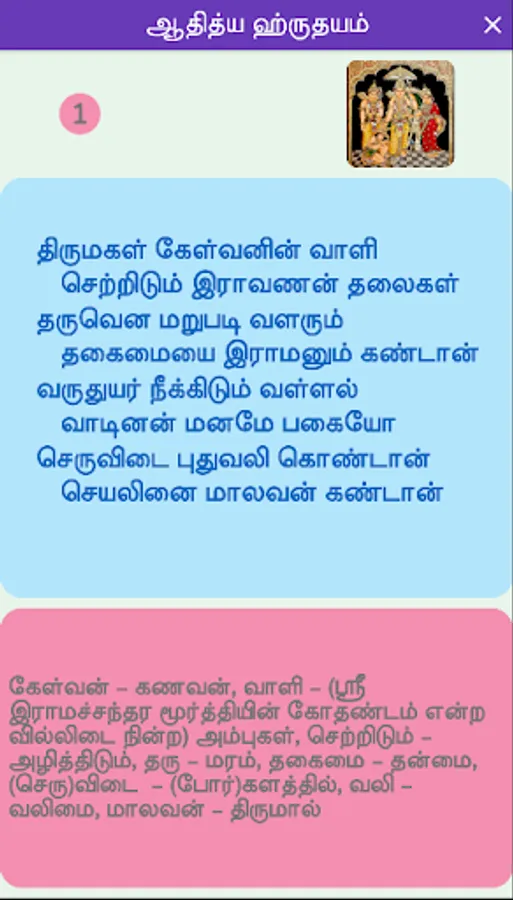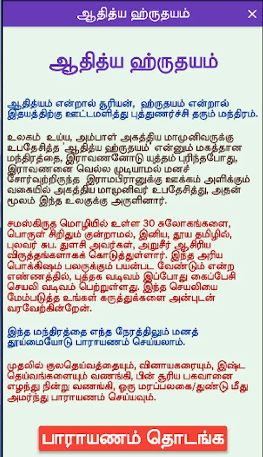 'Aditya Hrudayam' contains 30 slogans written in the Sanskrit language. With proper translation, Pulavar Supa. Thulasi re-written all the slogans in the Tamil language as ‘Aasiriya Viruthams’. His work is a treasure for the Tamil-speaking community. With due respect and gratitude to Pulavar, this mobile App is created with the intention to share this treasure with the Tamil-speaking community and make the reciting process easy.