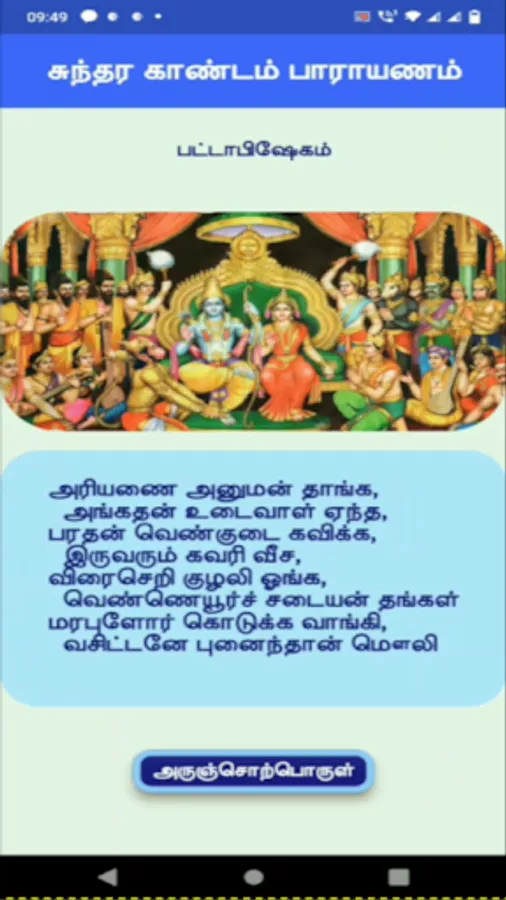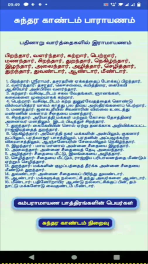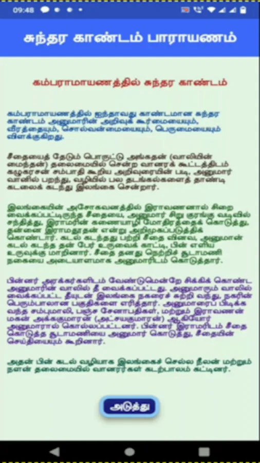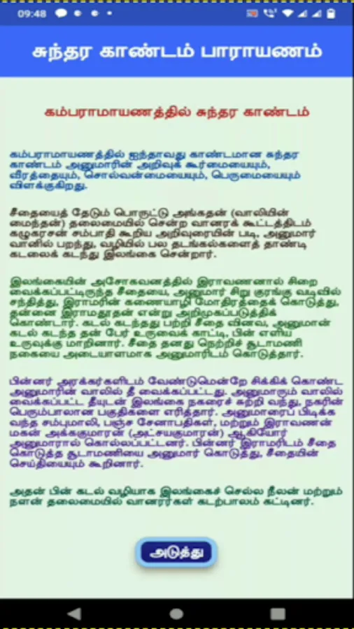 'Sundara Kandam Parayanam' app has scrollable pages (screens) in the following order:
