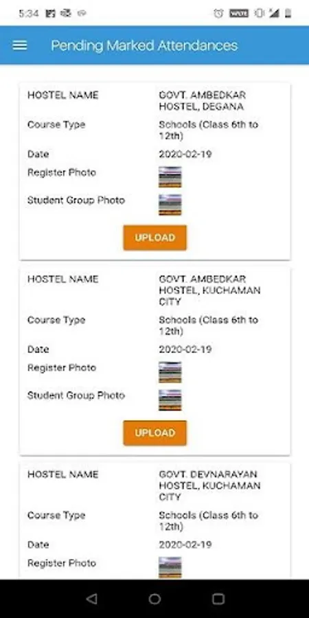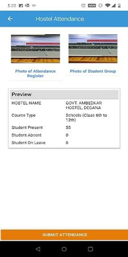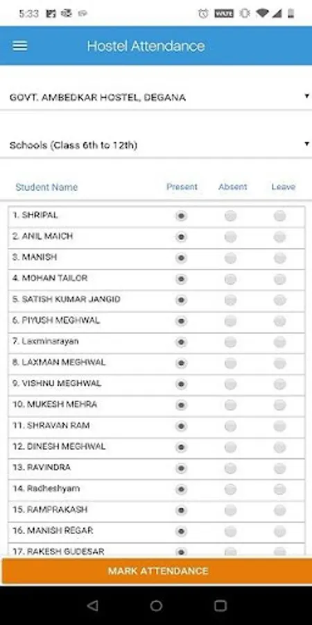 Warden/Superintendent can mark student Present,Absent or Leave. This app also captured attendance sheet photo,presented student and Group Photo