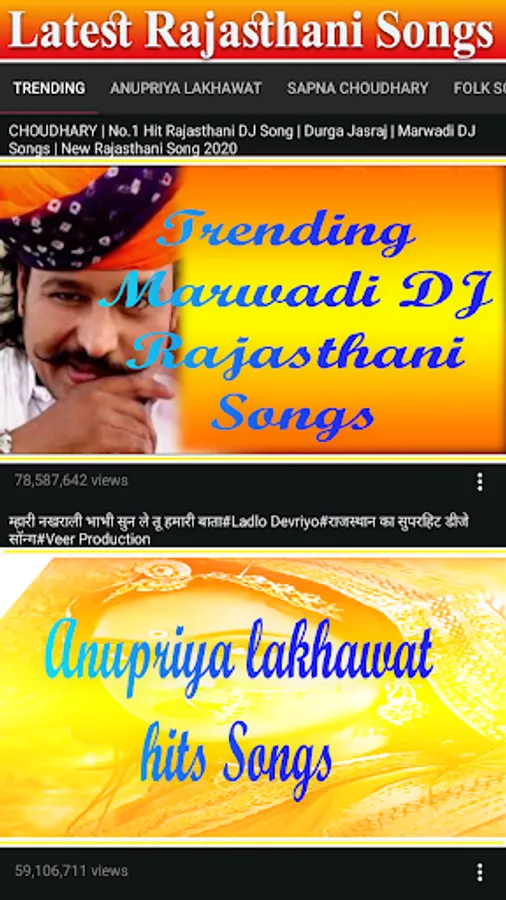 Rajasthani Song app contains all you need to listen. Here you can view the latest trending Rajasthani video, refresh your mood with the new Rajasthani song. Unlimited access to super hit collection of Marwadi, Rajasthani bhajan, Rajasthani lok geet, and folk song.
