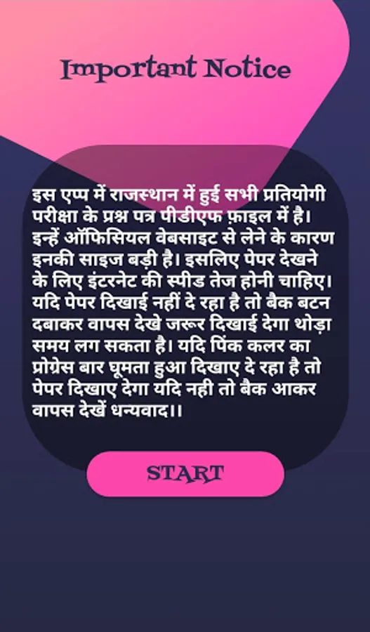 नमस्ते, हमने इस ऐप में आपके लिए राजस्थान मे आयोजित होने वाली सभी प्रतियोगी परीक्षा के पिछले वर्षों के आए हुए प्रश्न पत्रों का समावेश किया है। राजस्थान जी.के. की तैयारी करने वाले विद्यार्थियों के लिए विशेष रूप से तैयार की गई एप्प है जिसमे ऑफिसियल वेबसाइट में डाले गए प्रश्न पत्रों के साथ उनकी उत्तर कुंजी भी साथ है। आप इसको एक बार यूज जरूर करके देखें। हम इसमें समय-समय पर नए प्रश्न पत्रों को भी अपडेट करते रहते हैं इसलिए आप एप्प को अपडेट करते रहे।
