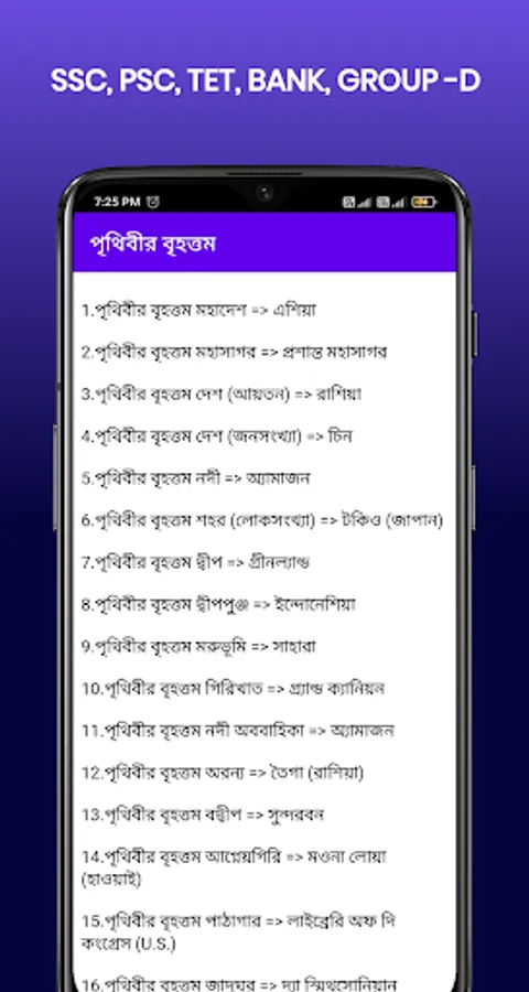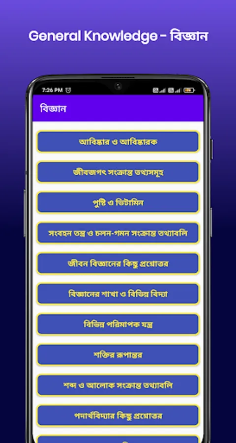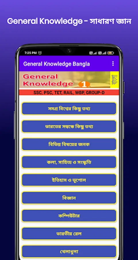 General Knowledge - সাধারণ জ্ঞান is a Bengali educational general knowledge app. This application is easily accessible to all Bengali speaking people, you can get a supporting role in any competitive examination. Use the application to get success in WBCS, TET, INDIAN RAIL, NTPC, BANK, WBP, SSC, PSC, and any other Group-D exams.