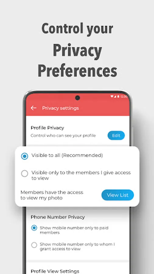 Our “Who Can See Me™” feature allows you complete control of who can see your profile and contact you. You can decide to set various criteria such as age, income, education, community etc., and allow only matches who meet these criteria to view and contact you.