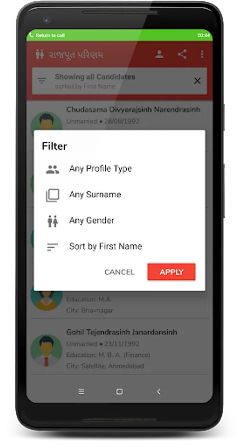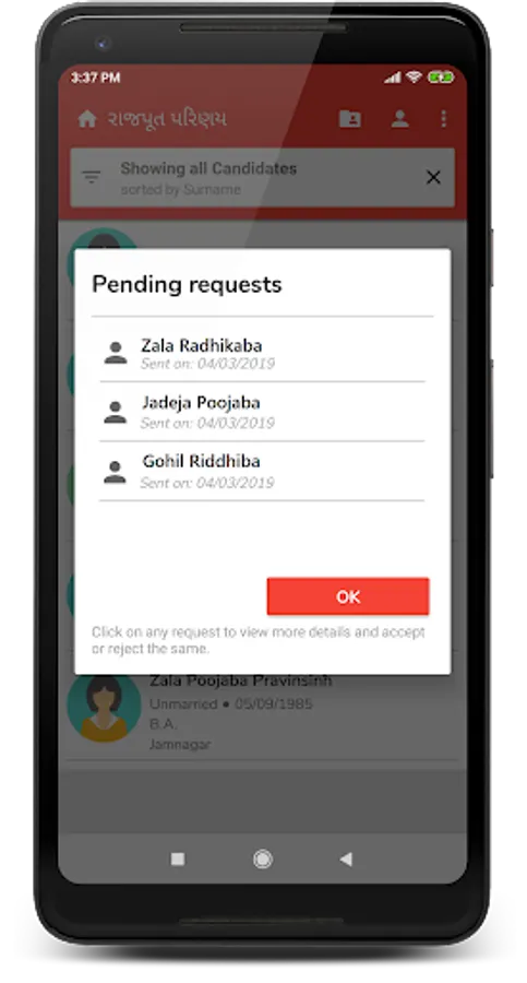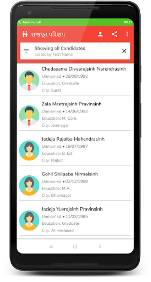 - ઉમેદવારોની યાદીને જન્મતારીખ, અટક અને પ્રોફાઇલ બનાવ્યા તારીખ મુજબ શૉર્ટ કરી શકાય છે