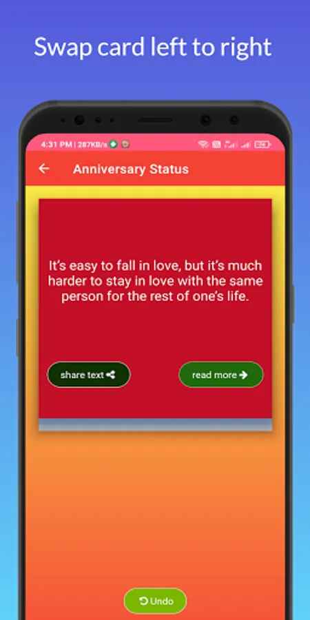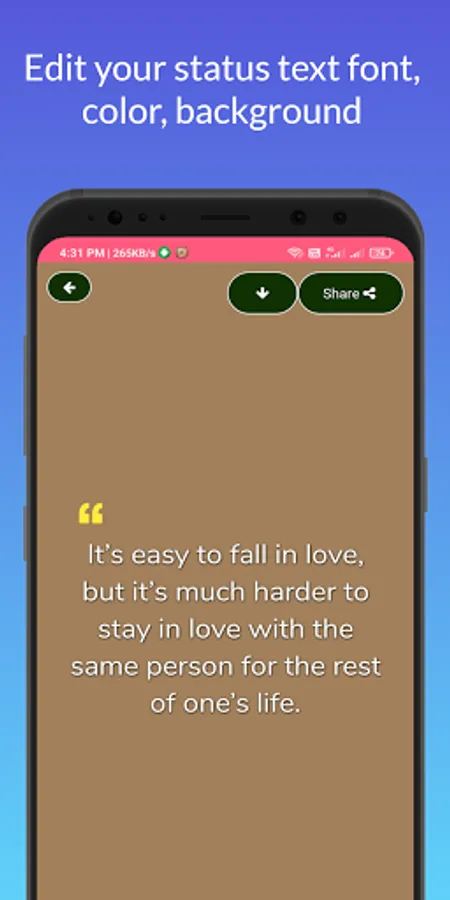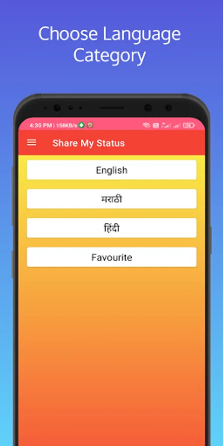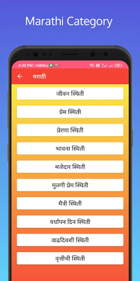 This app is very useful for anyone who is posting their status on their Favorite social app. We have 50,000+ more status content. Specific content for your specific work. Happy Birthday to someone, Happy Wedding, Special Thanksgiving, Motivations and much more. High-Quality Content. More than 50 fonts in Marathi, Hindi and English. Color selection to your liking. This application is useful for people from all walks of life.