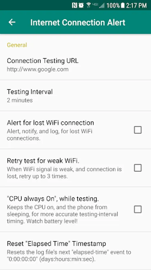 An "Alert for lost WiFi Connection" option is provided, so you can observe any lost connections directly related to losing the WiFi network. Useful when you want to be alerted if you go out-of-range of your home WiFi. When this option is not enabled on a phone, then your phone may automatically switch to mobile data if the WiFi connection is lost, and you will not get notifications.