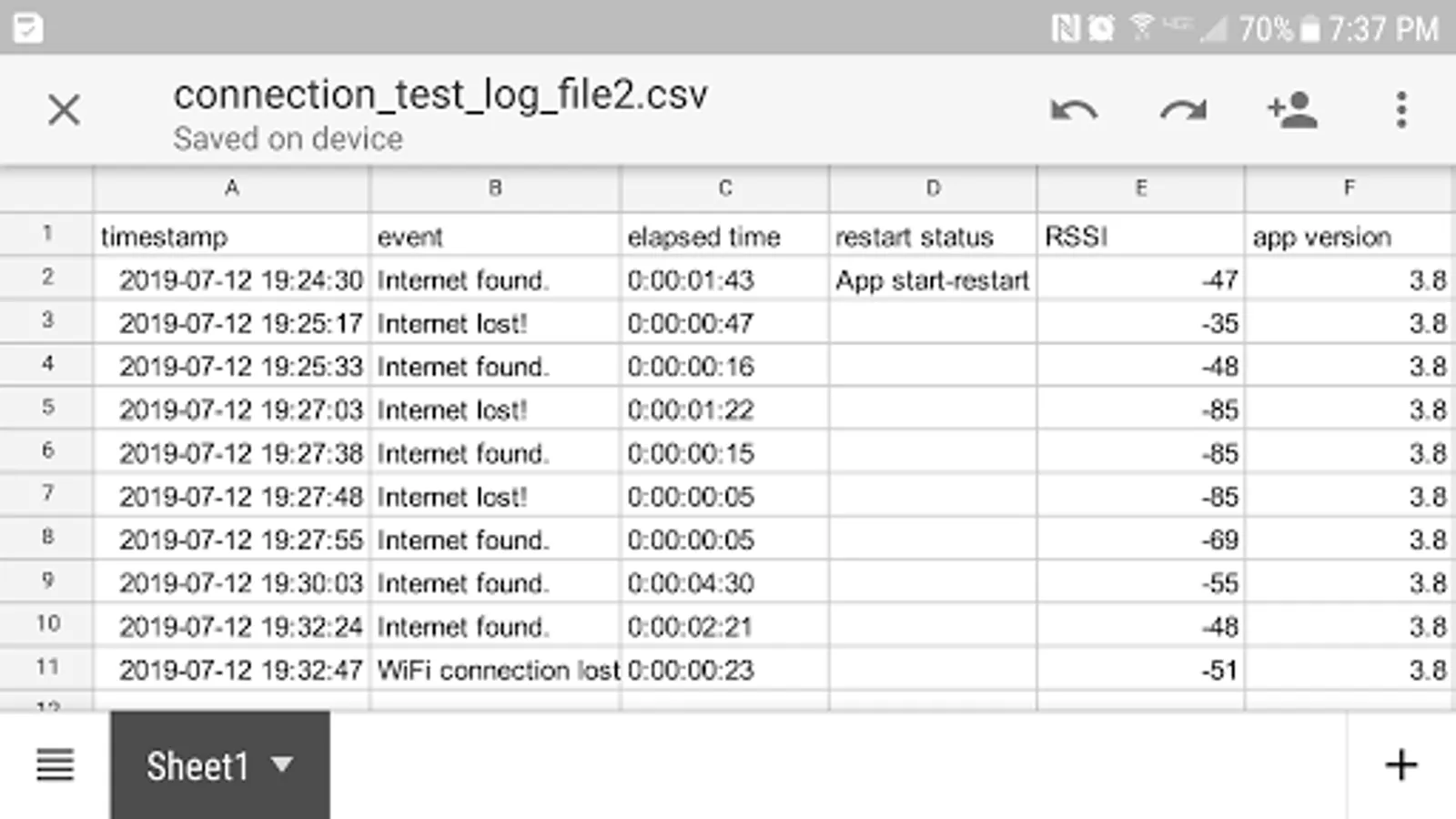 All "connection events" are logged to a spreadsheet-style csv file, with each new status, and the elapsed time since the connection was lost or found.
