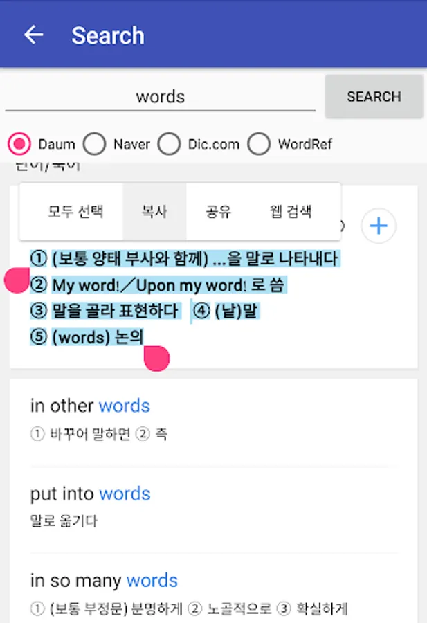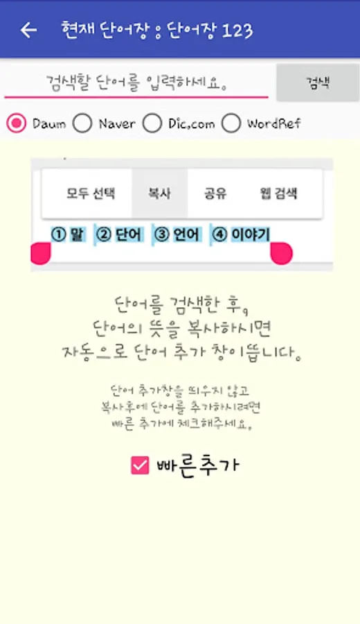 2. 'Search' menu that allows you to browse and add more words and the words in my vocabulary the word questions!