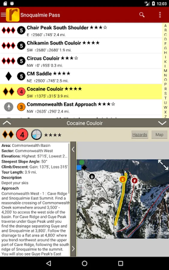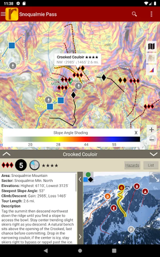 Browse climbs and ski descents on a map or in the list format of your choice, filter and search in seconds, then navigate using your phone's GPS with a single tap. The app navigates you through the trail system to your climb, turn by turn, and tracks your backcountry snow adventures with offline topo maps and slope angle shading.