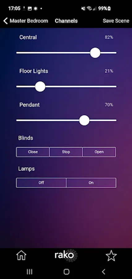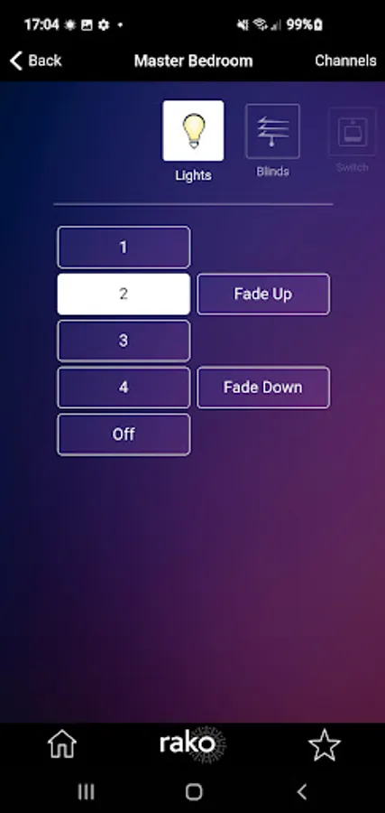 The application gives control of any room, whether it be lighting or curtain/blind control. Access to all available rooms, scenes and channels, all of which can be named for easy identification.