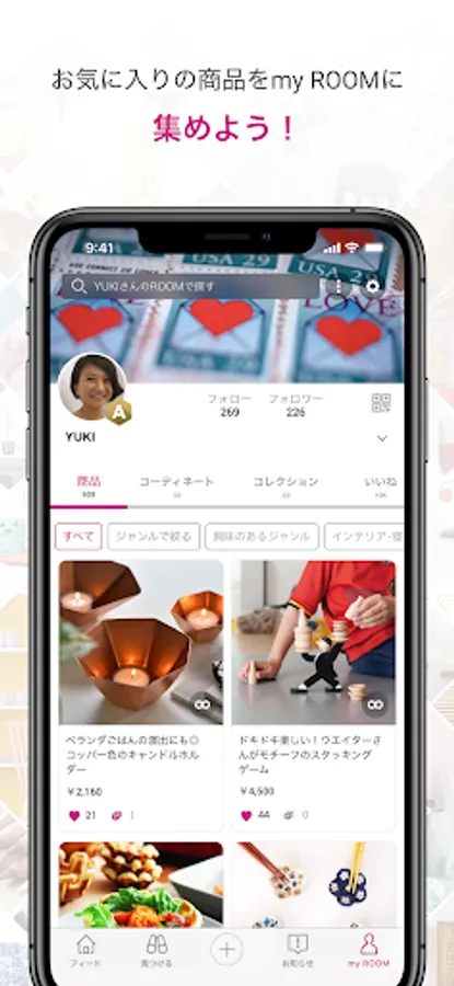 You can collect what you want and what you bought as your favorite items. Check out other people's favorite products and collect them in my ROOM.