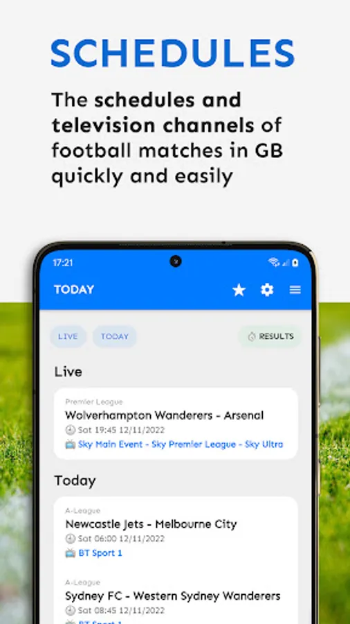 All the schedules and the television channels where each of the football matches that are broadcasted in Great Britain (England, Scotland, Wales and Northern Ireland). Now also with live scores and fixtures! Don't miss any sporting event!