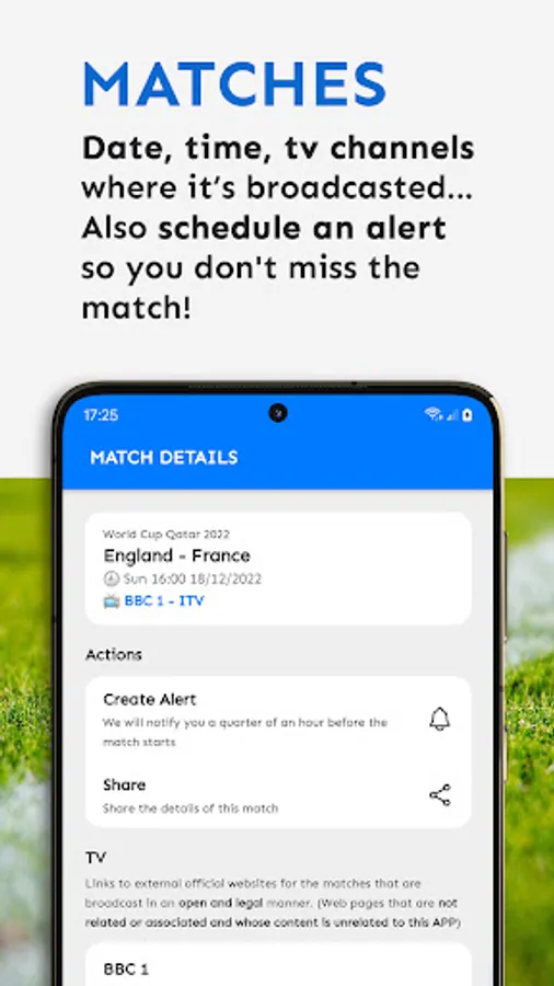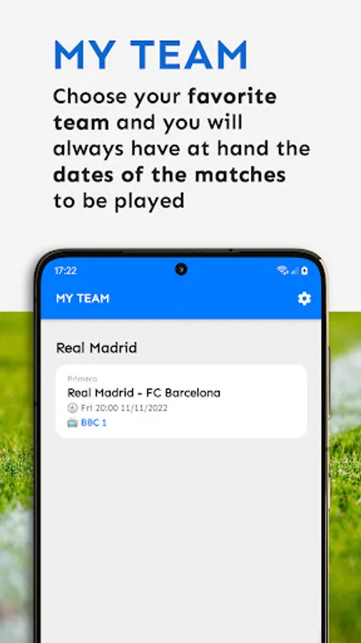 Never again will you miss a match or event of your favorite team because you don't know its schedule or on which network it is live broadcasted! Set an alert to be notified 15 minutes before the game starts! And if you want you can pass the match details with the 'Share' option!