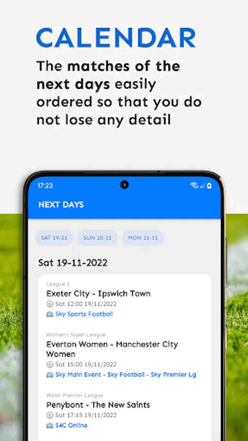 Choose your favorite football team and league to always have at hand the match schedules of Manchester City, United, Liverpool or Chelsea and many others, including the best european teams.