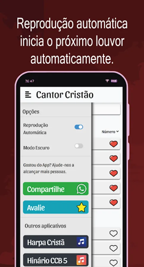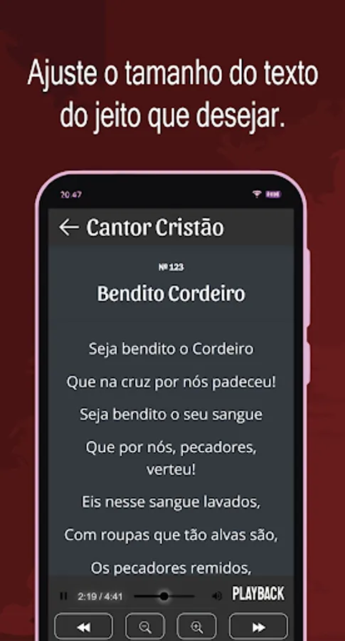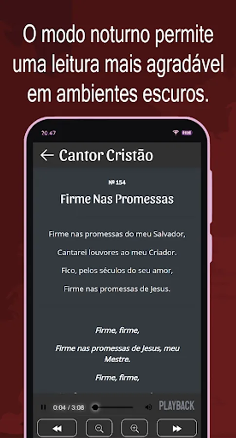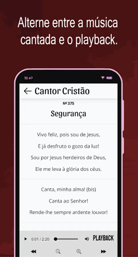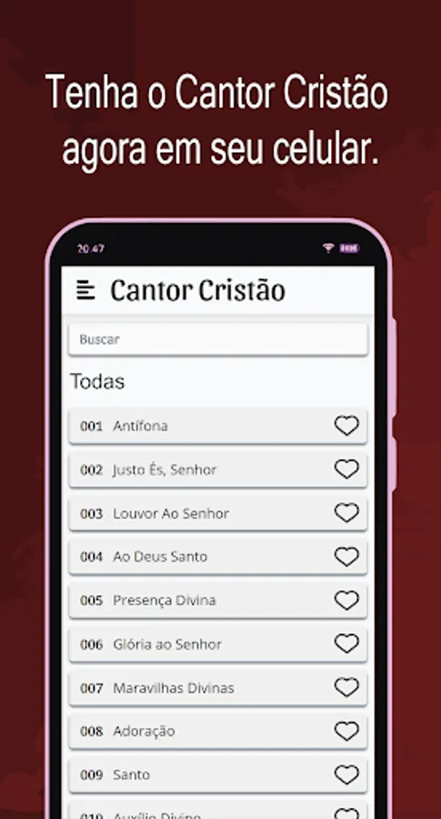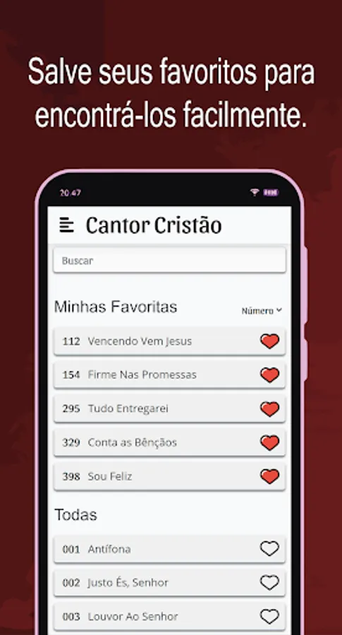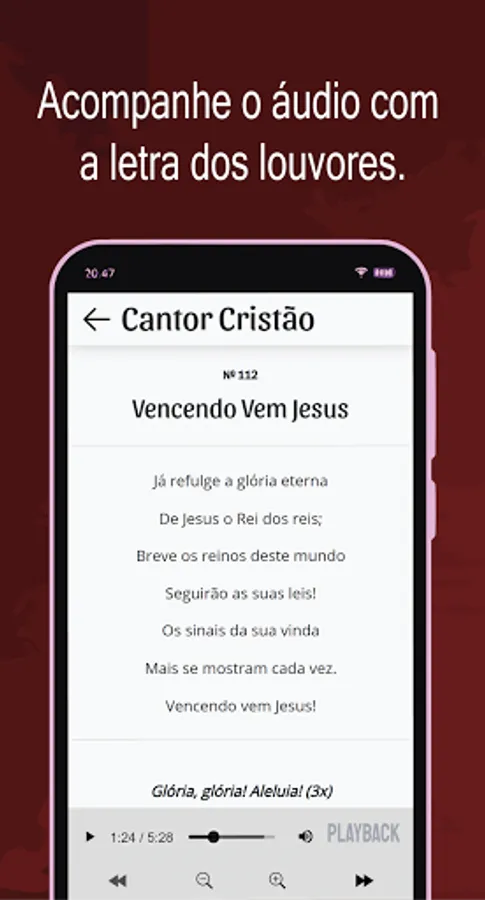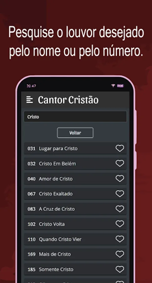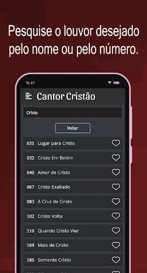 Hear and read all the lyrics of the hymns and praises of the Christian Singer Hymnal at any time directly from your mobile, with simple design and easy navigation, easily find all the praises of the Christian Singer Hymnal with audio.