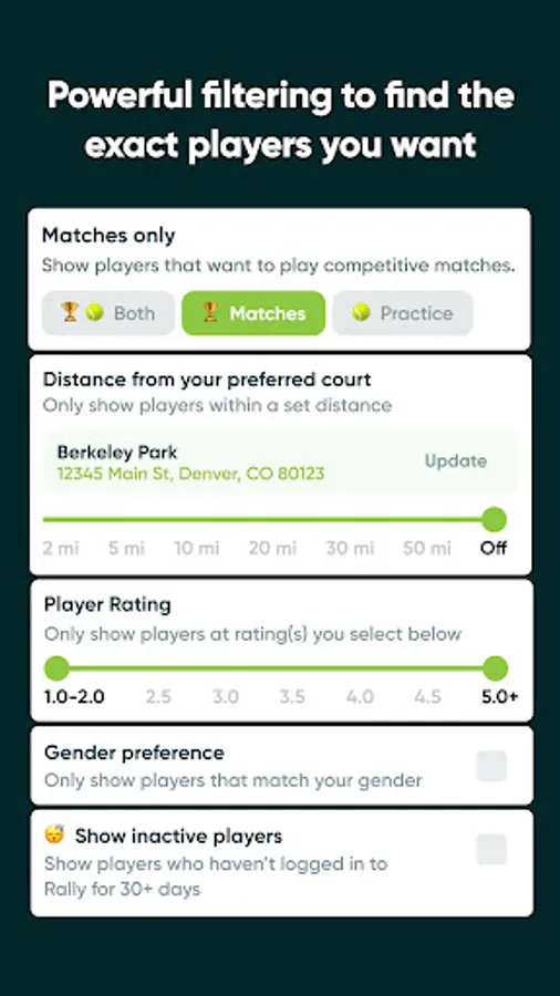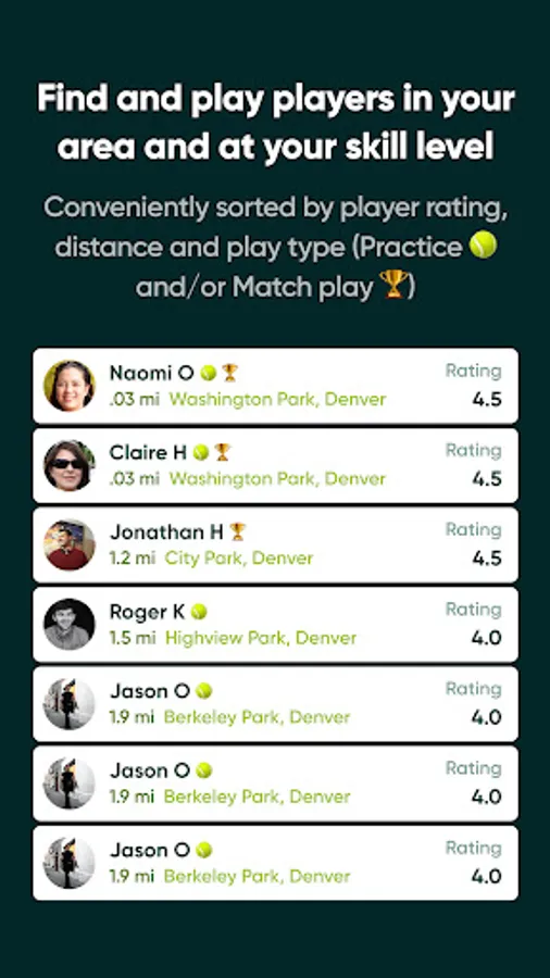Are you ready to play more tennis? Easily filter and find the best playing partners in your area to compete or practice with.