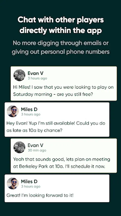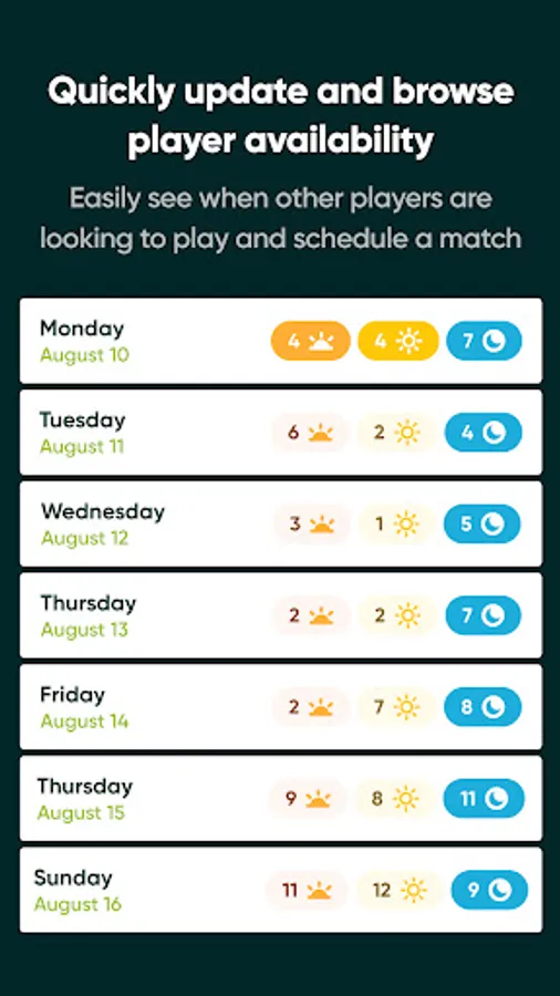 - Easily share and browse player availability to quickly see who can play and when. Chat directly with players in the app to schedule a match.