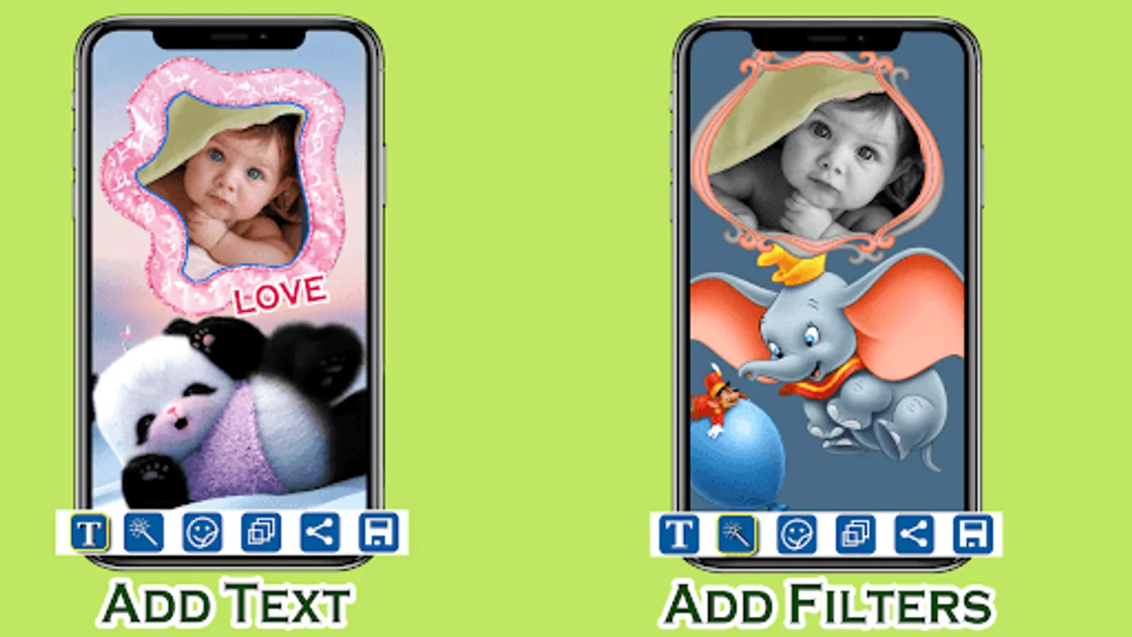 Once you add the photo of your baby girl or baby boy, you can additionally tweak the text, add filters, alter the layers and more. This is what separates our kids frames app from the other kids photo editors. At the end you can save the photo and, or, share it with your friends, family, followers, or anyone you like.