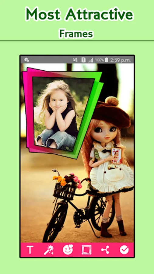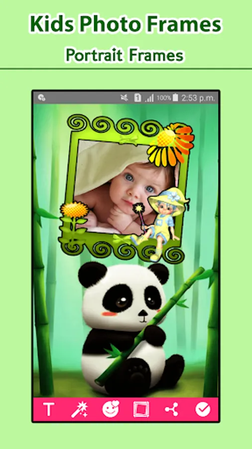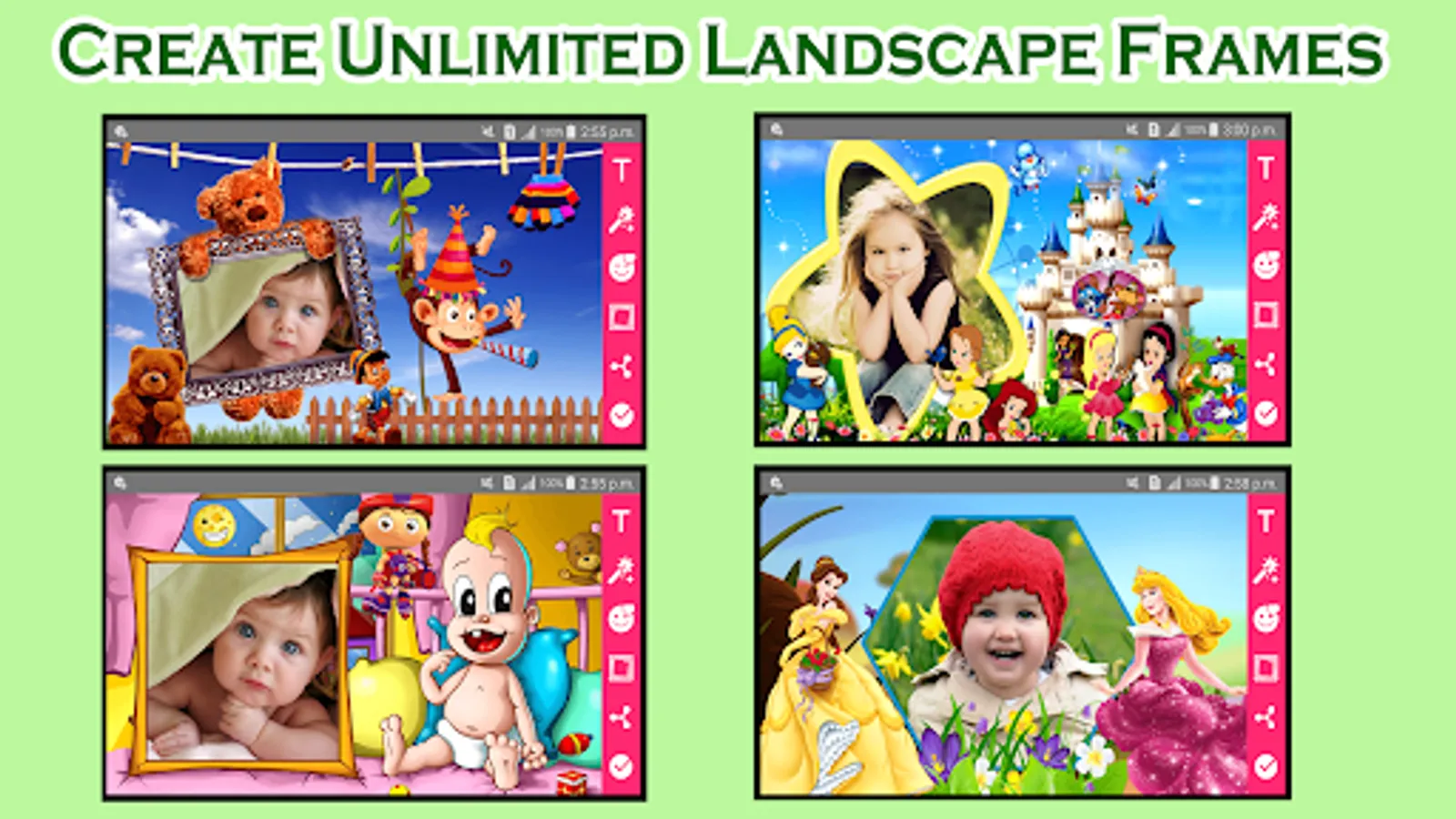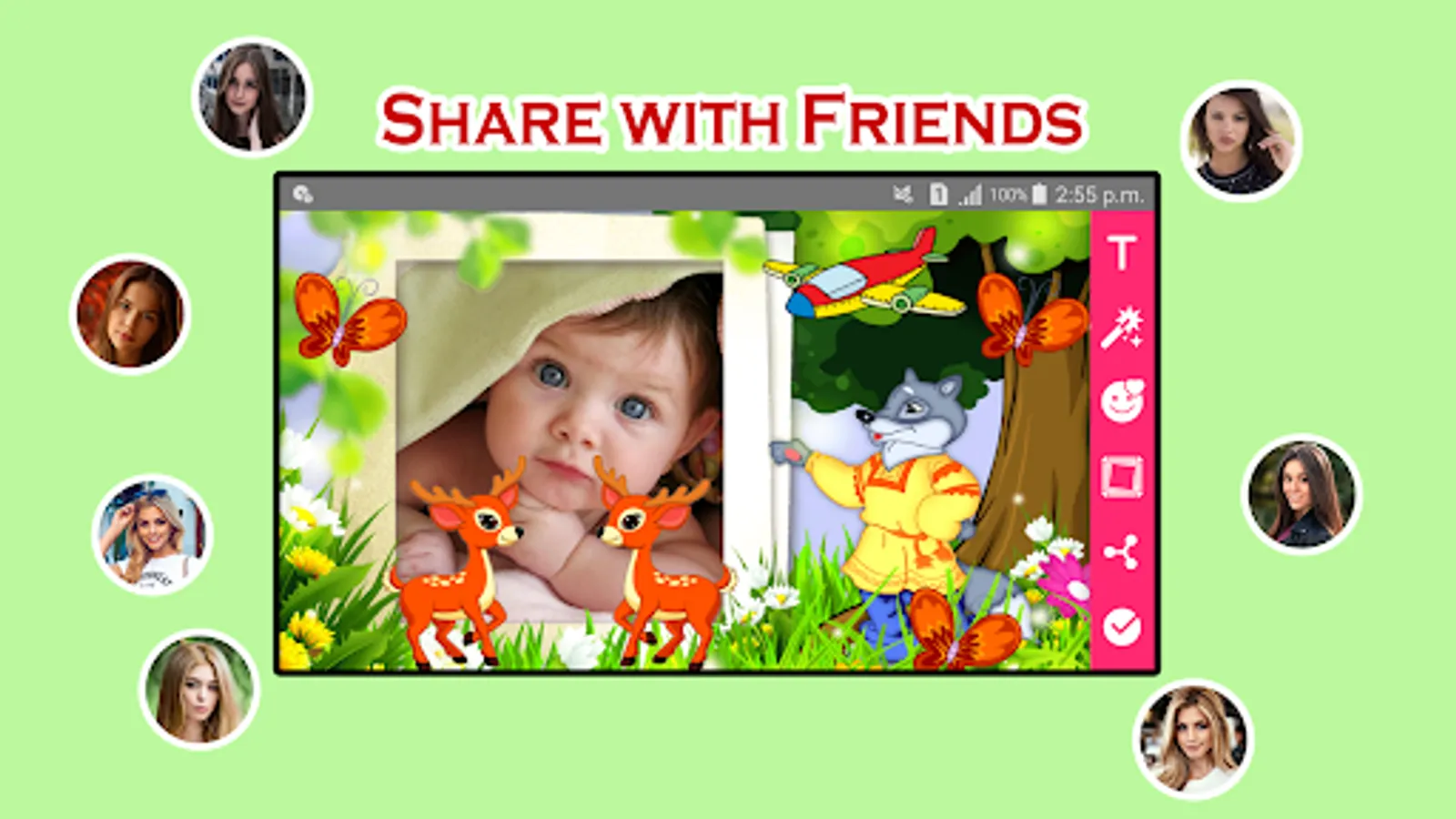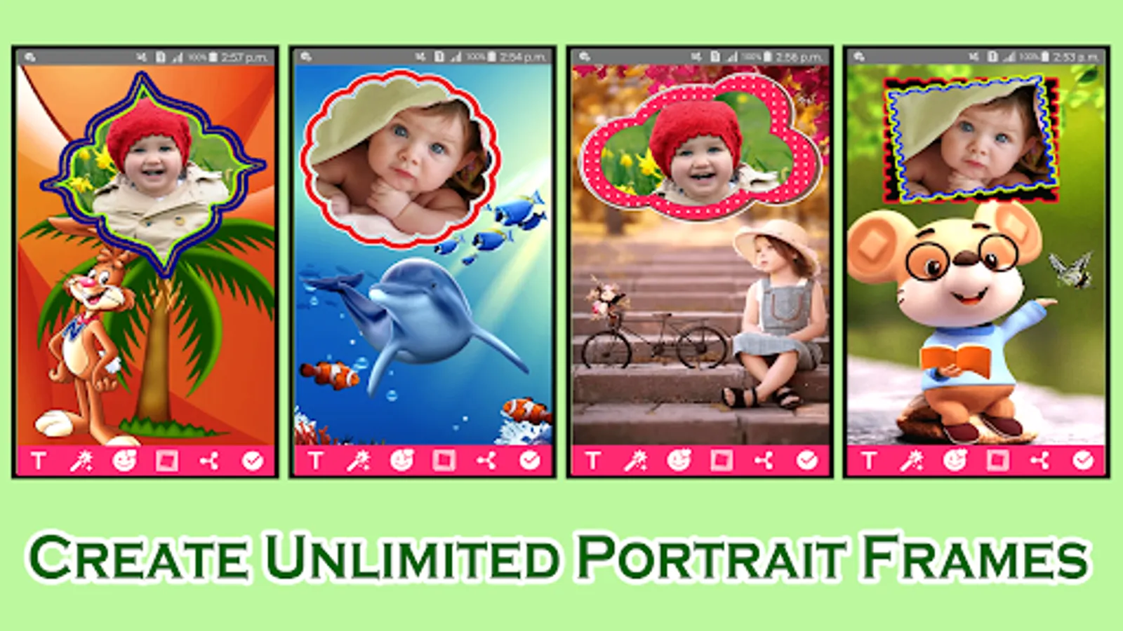 Meet children's frames β Picture Baby Editor which allows you to enter your children's images inside cute frames to make lovely kids collage photos, or baby wallpapers, and share them on social media or save on your phone. Creating pretty photos with your loved children or nephews has never been as easy as with this baby picture editor.