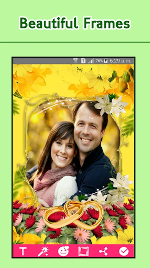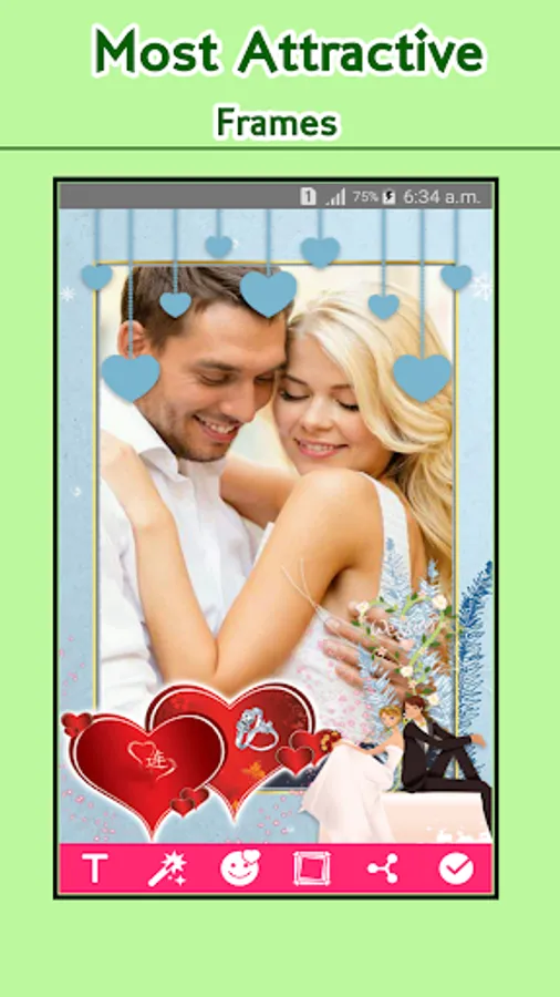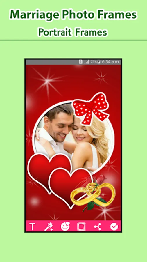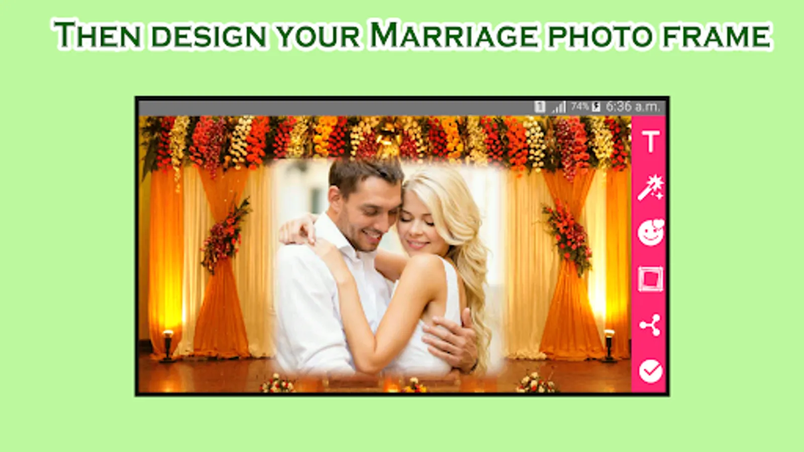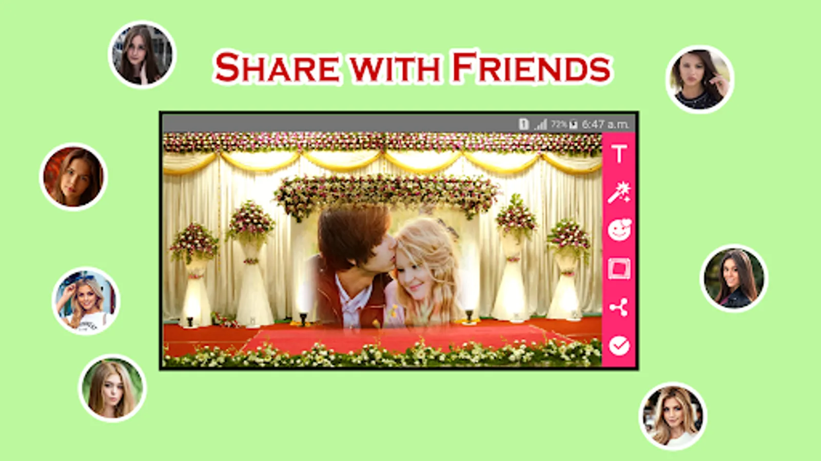 ✔Select any photo / picture from Gallery (or) Take a picture using Camera and embed the photo of your choice into beautiful Marriage Photo Frames.