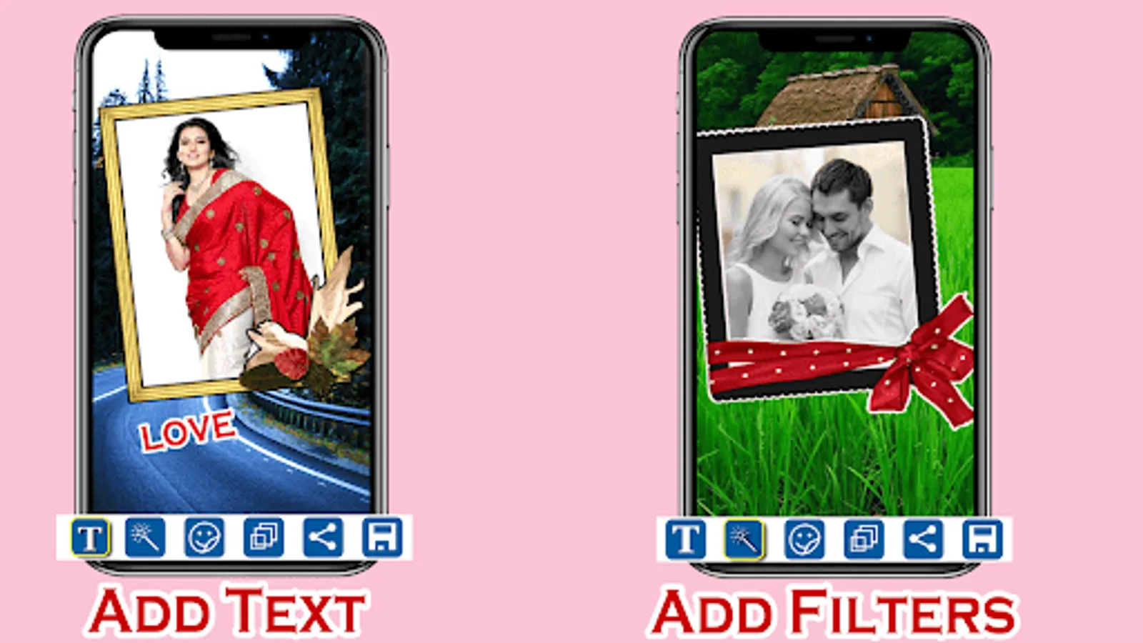 Unlike most nature photo editor apps where you can just add frames to photos, our nature pictures photo editor also allows you to add interesting nature filters and text. Using the add text to photo feature you can create quotes, greetings, best wishes cards, and more! You can even create inspiring nature photo wallpapers and set them as wallpaper on your phone.