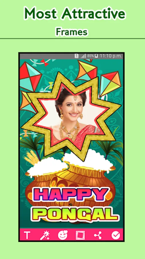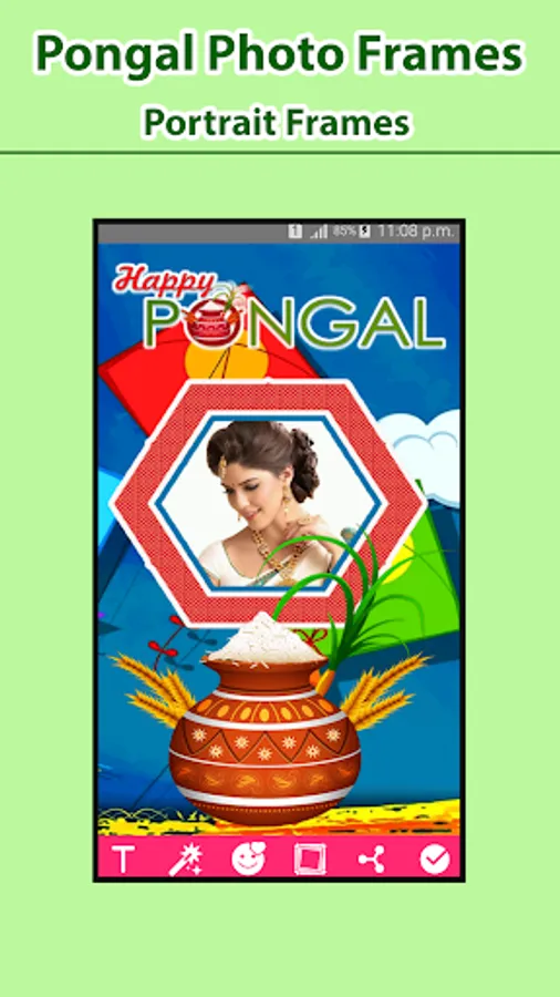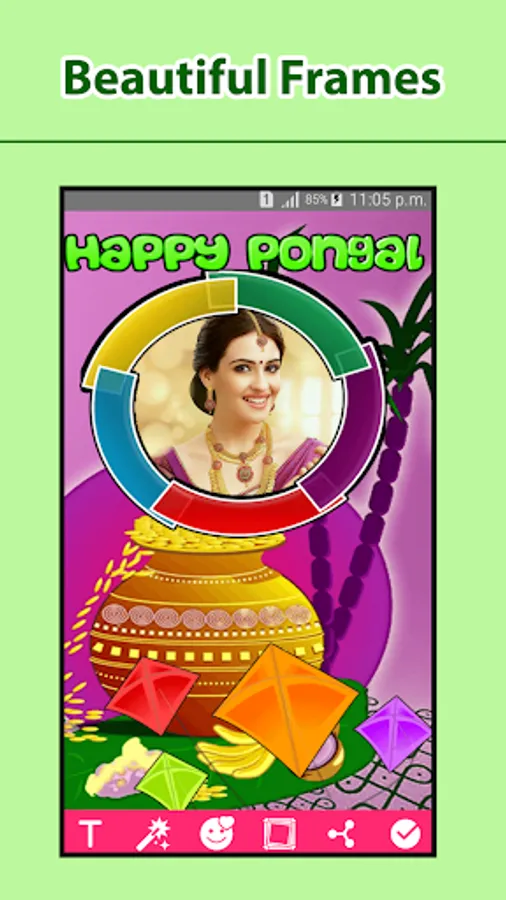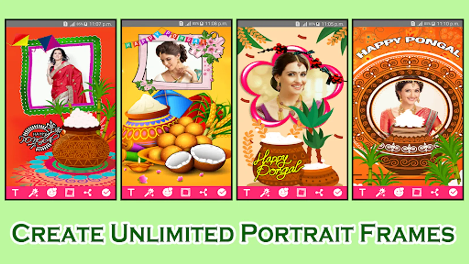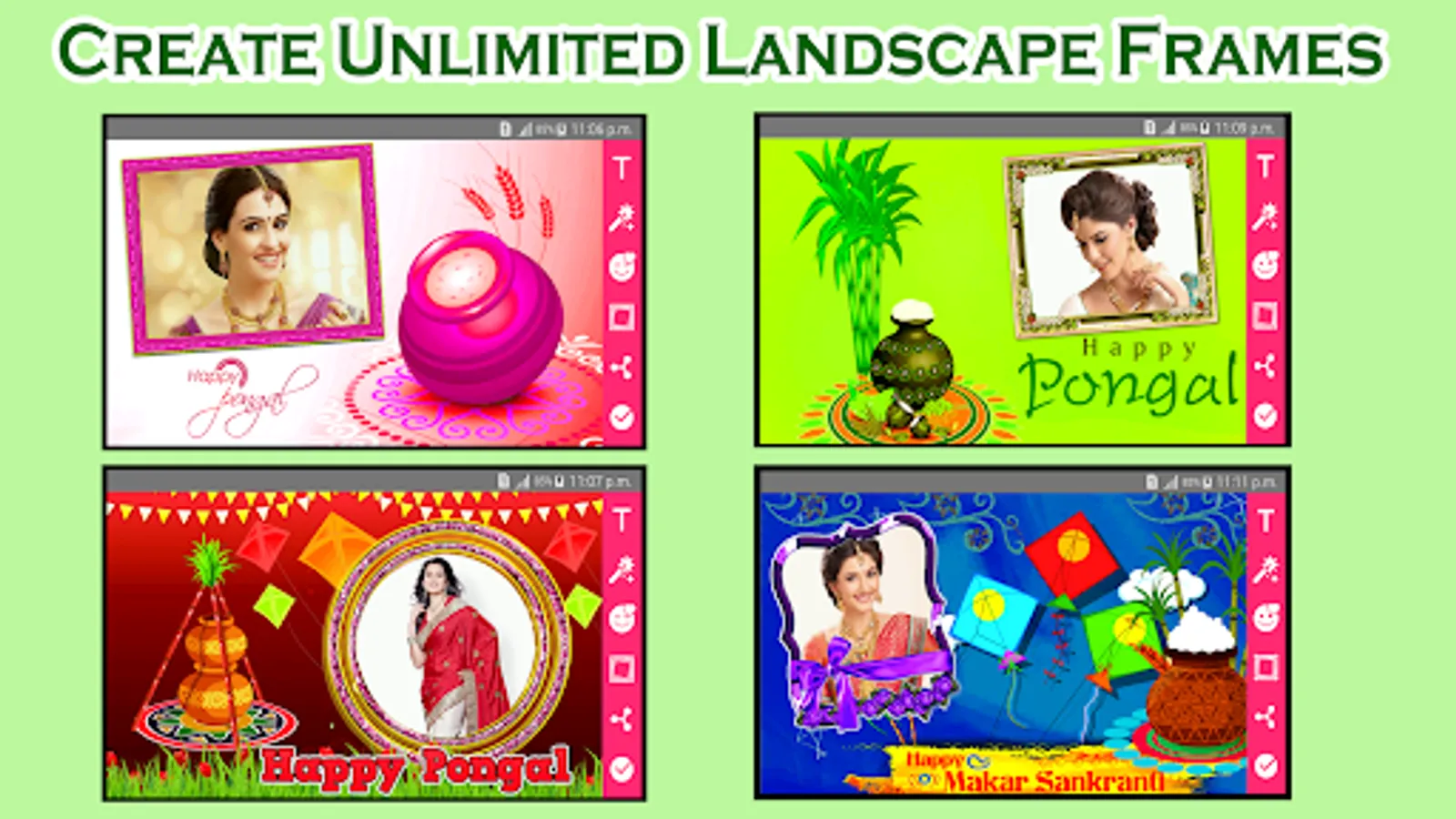 ✔ Wide Range of Frames: Over 100 HD quality portrait and landscape frames featuring beautiful and colorful designs for Pongal and Sankranti.