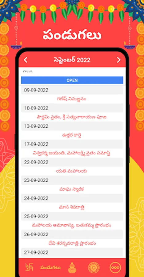 2.In Telugu panchangam app highlighted pournami, amavasya and festival days with red, black & white dots on below respective days.