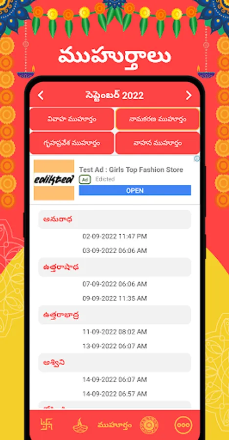 4.In Muhurtham tab read auspicious time of Vivaha Muhurthaalu, Namakarana Muhurthaalu, Gruhapravesa Muhurthaalu & Vahana Muhurthaalu to start you precious occasion.