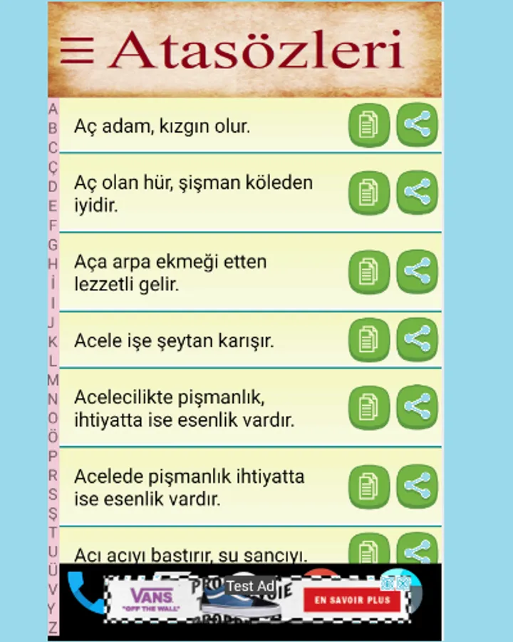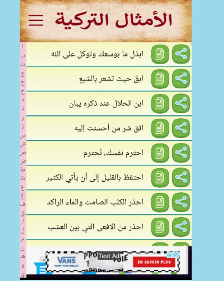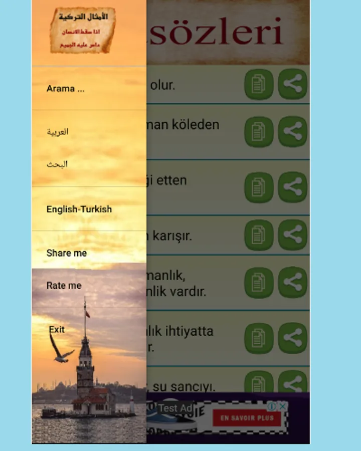 يحتوي هذا التطبيق على 800 مثل تركي تقريبا مترجم إلى اللغة العربية وهو يساعدك على تعلم مفردات جديدة في اللغة التركية