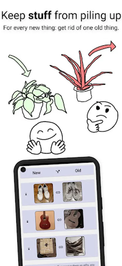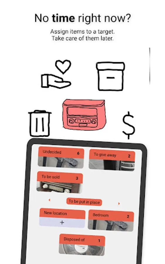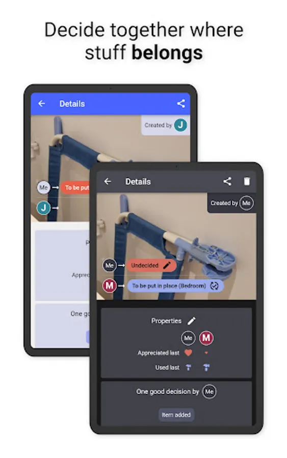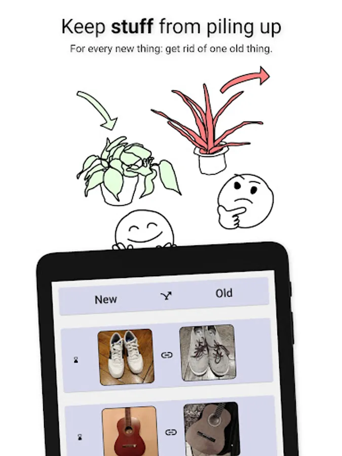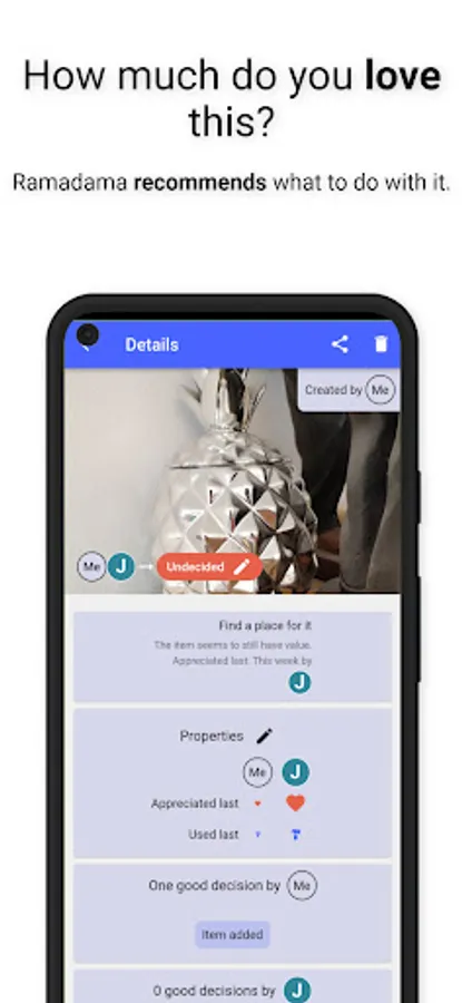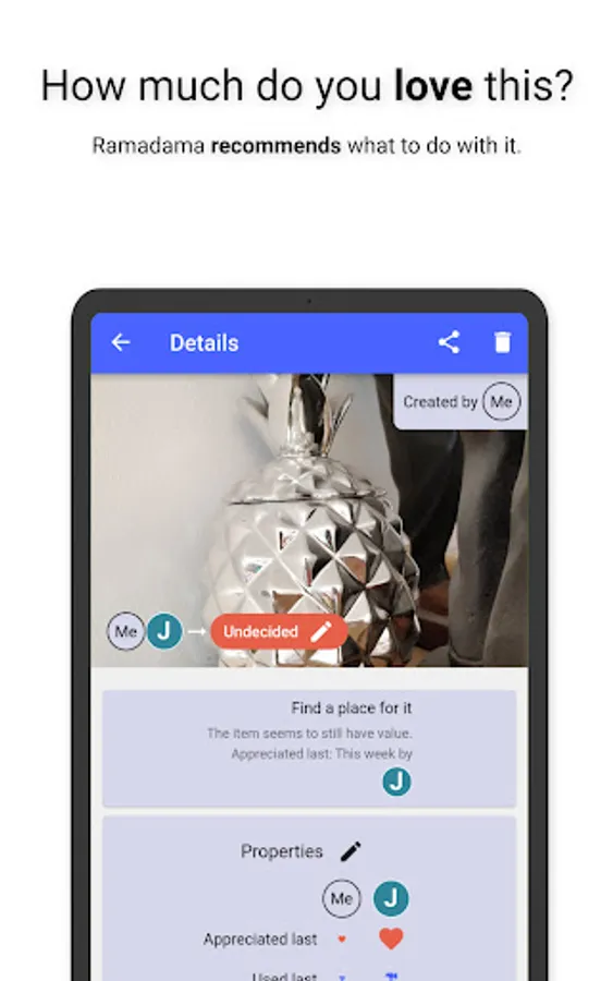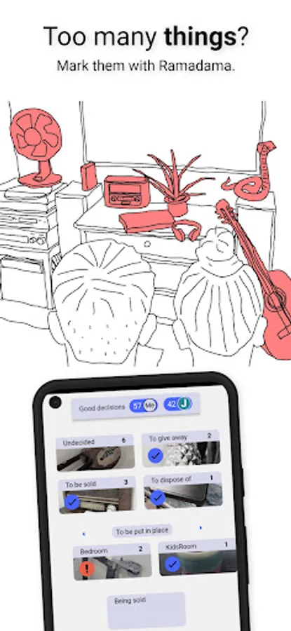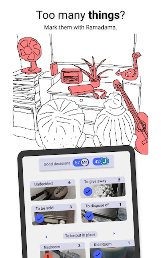 Ramadama helps you decide: Is that a beloved thing oder can it go? Cleanse your household together: Up to 3 Players can add items to a household. The app helps you to solve conflicts and to keep an overview.