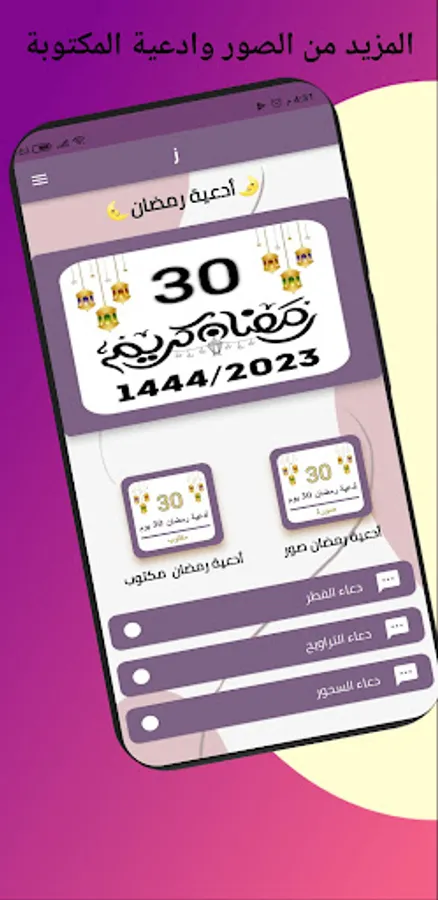 The application of Ramadan 2023 supplications - Ramadan supplications 30 days also allows you to have a photo gallery that contains images of Ramadan 30 days collected in one place that you can share or download to your Android phone for later review or sharing on social media directly from your phone.