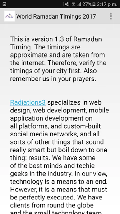 Ramadan Calendar of 224 Countries. Ramadan Time is an app dedicated to the entire Muslim community, worldwide. This application provides complete schedule for Sehar and Iftar time for the whole world. This app requires internet on first usage to select country and city and then it works offline.