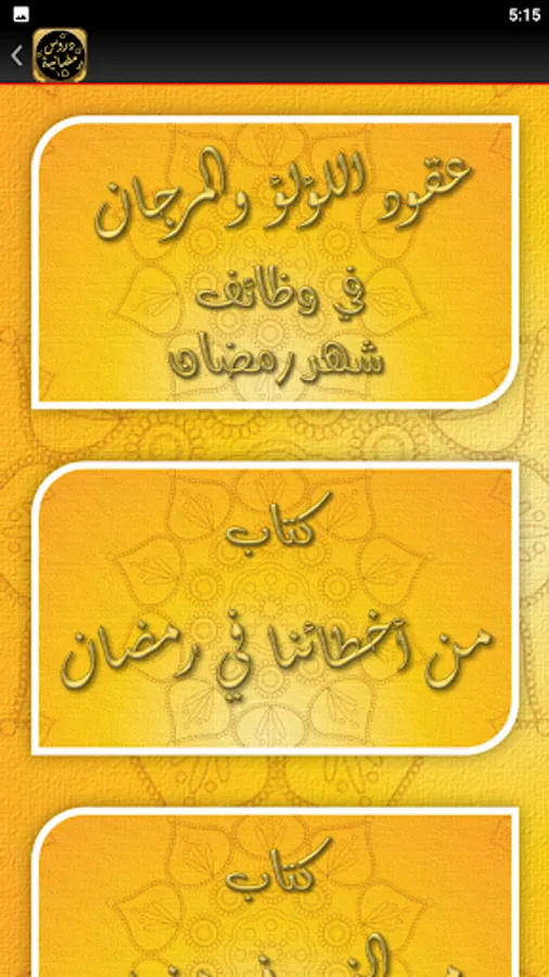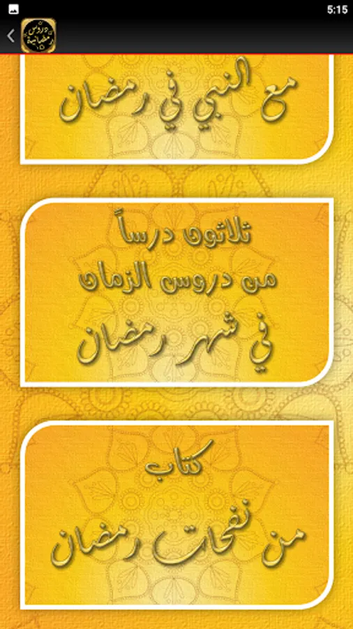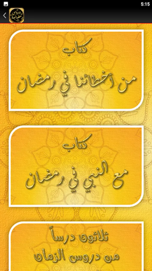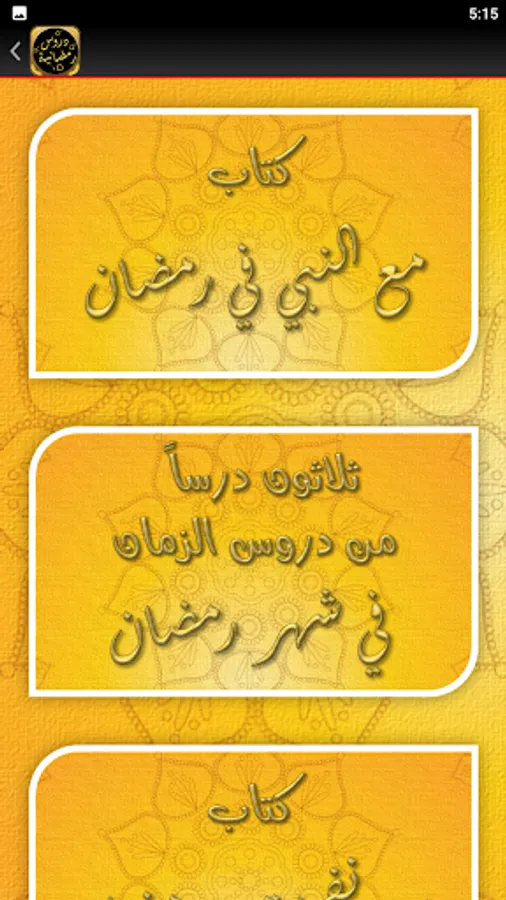 يحتوي التطبيق على العديد من الكتب والدروس الرمضانية المكتوبة من أهمها نفحات رمضانية و احكام الصيام والقيام وكتاب ثلاثون درسا في رمضان و من اخطائنا في رمضان وكتاب مننفحات رمضان وأخيراً كتاب مع النبي في رمضان