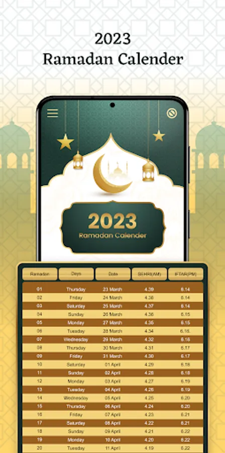 This year Ramadan date application with Ramadan calendar 2023 to see today Iftar and Sehri time. Ramadan time table with Iftar time today and sehri time today. Ramadan dates with 1st Ashra Dua, 2nd Ashra Dua and 3rd Ashra Dua. Check Iftar time today in the Holy month of Ramadan according to your GPS accurate location. Hijri Calendar 2023 is Islamic calendar which displays Ramadan Calendar 2023 along with Georgian calendar to see Sehri time today. Ramzan Calendar sehri Iftar shows Sehri end time today and Iftar time in my location. Ramzan Kareem is the fasting month of Muslims. Today’s Iftar time in my location can be viewed in app and Ramadan break fast time.