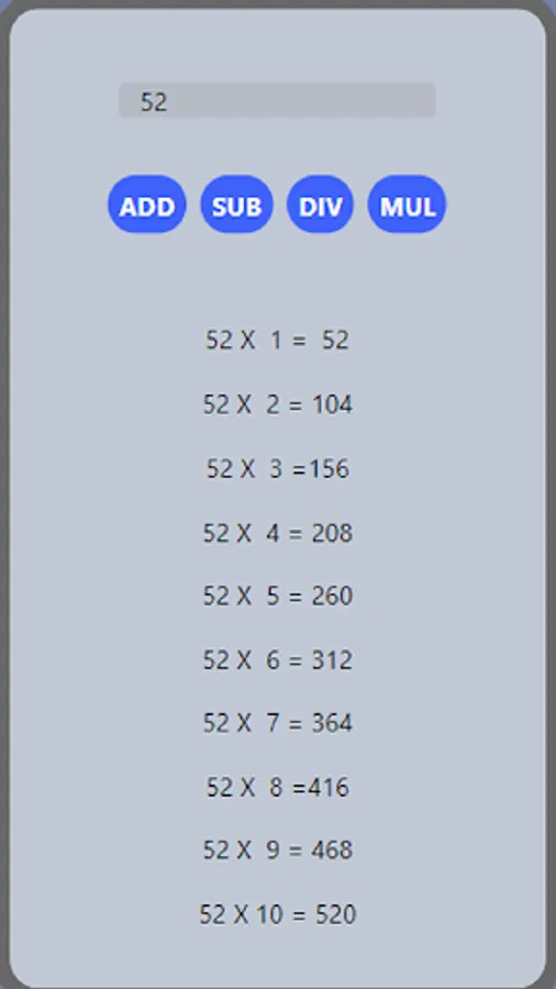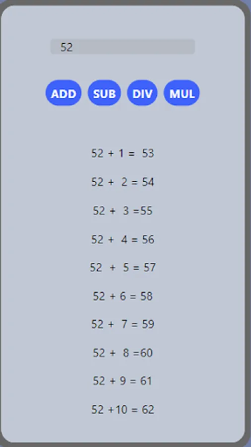 This Will generate the tables according to the user's needs. The app helps the small kid to know the add/sub/div/multiplication tables.