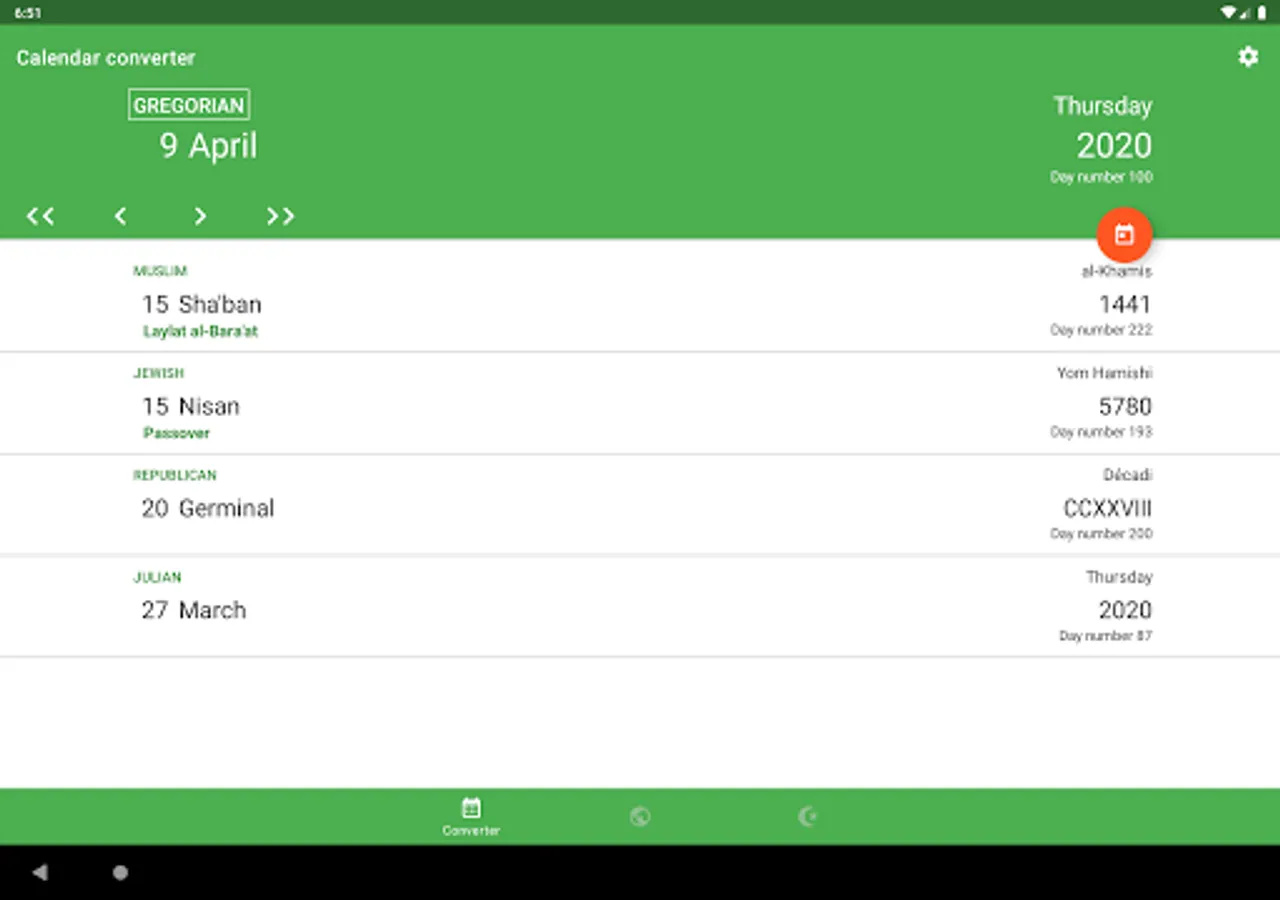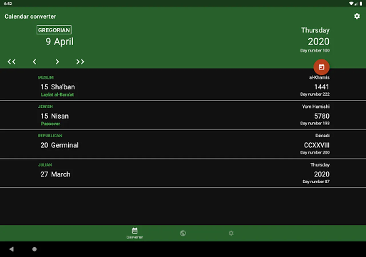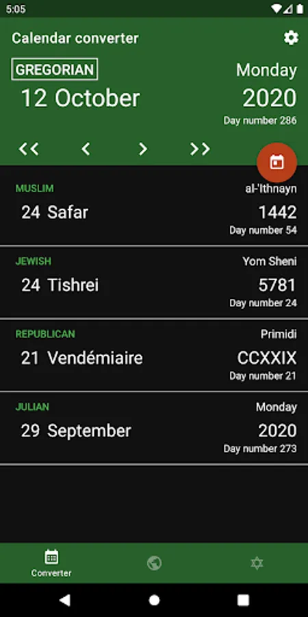 You can enter a date for one of these calendars and the date will then automatically be converted into the other calendars. Different buttons will help you to navigate easily through the dates.