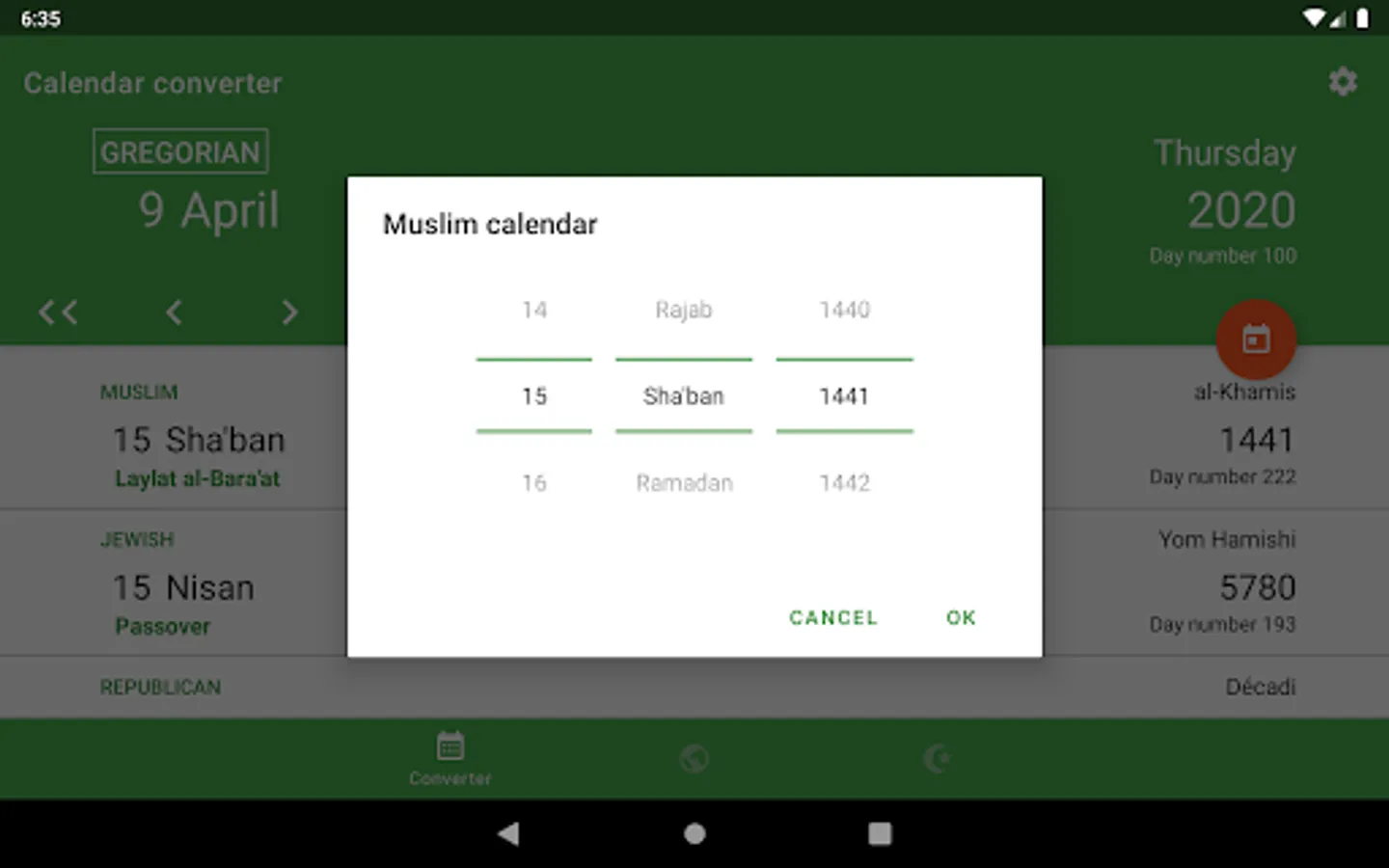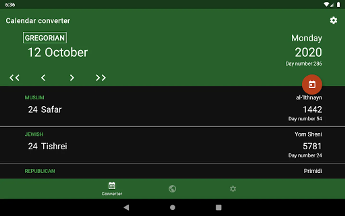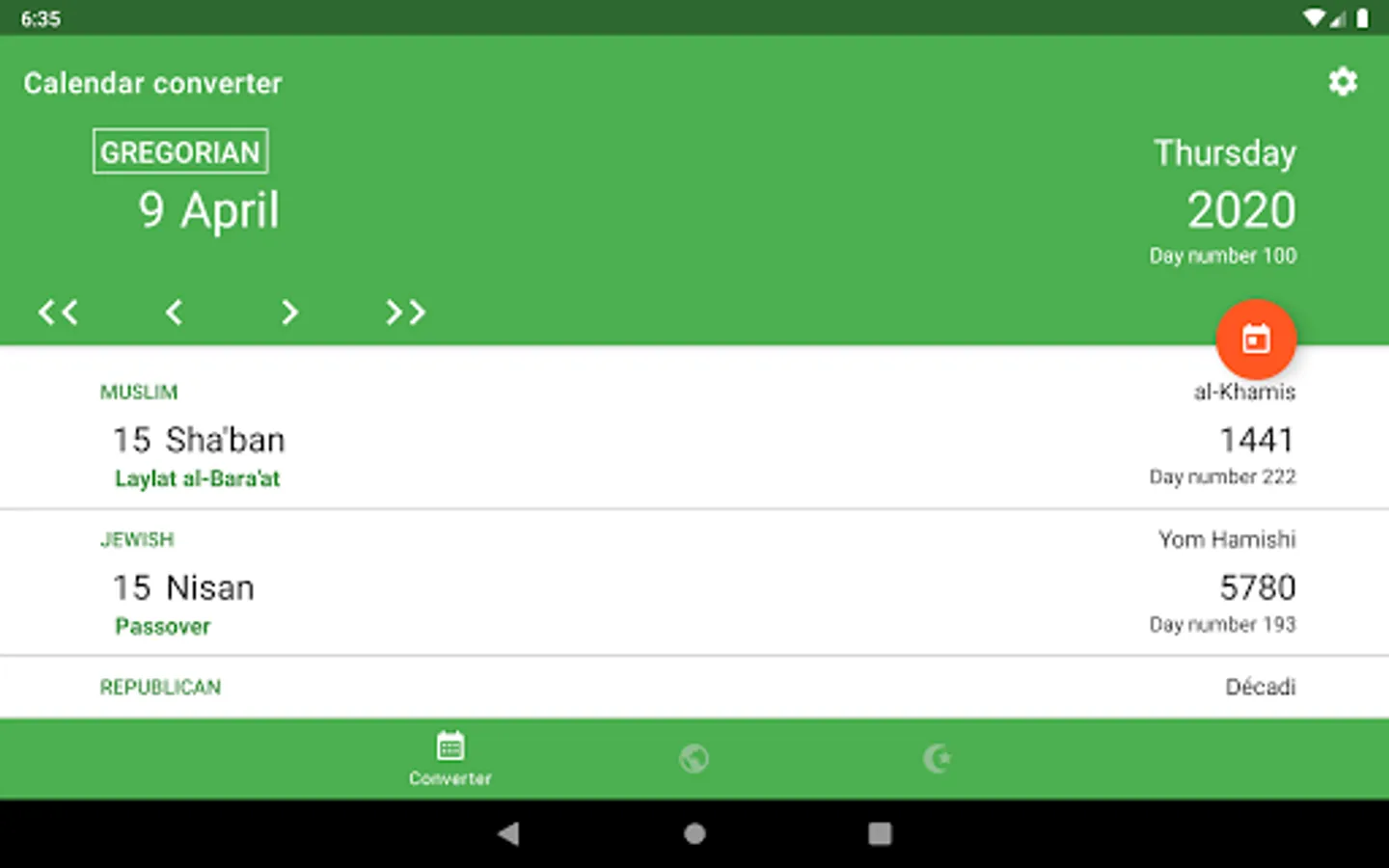 You can enter a date for one of these calendars and the date will then automatically be converted into the other calendars. Different buttons will help you to navigate easily through the dates.