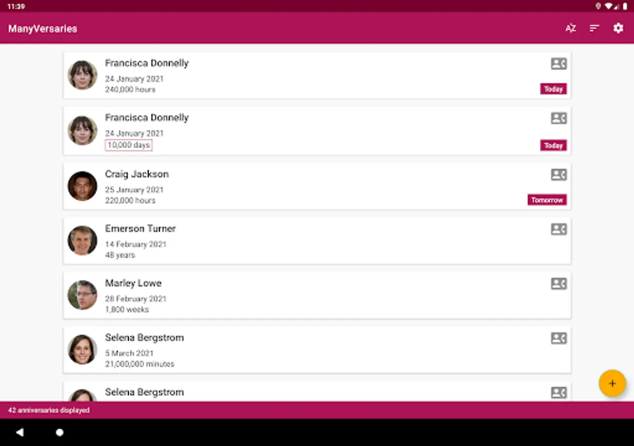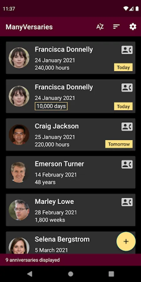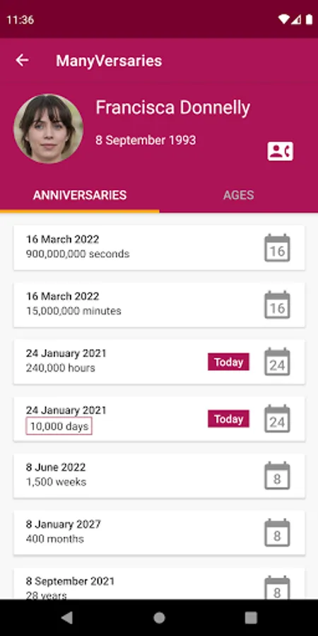 For each contact you can display a screen with all their anniversaries and their ages in seconds, minutes, hours, days, weeks, months and years.