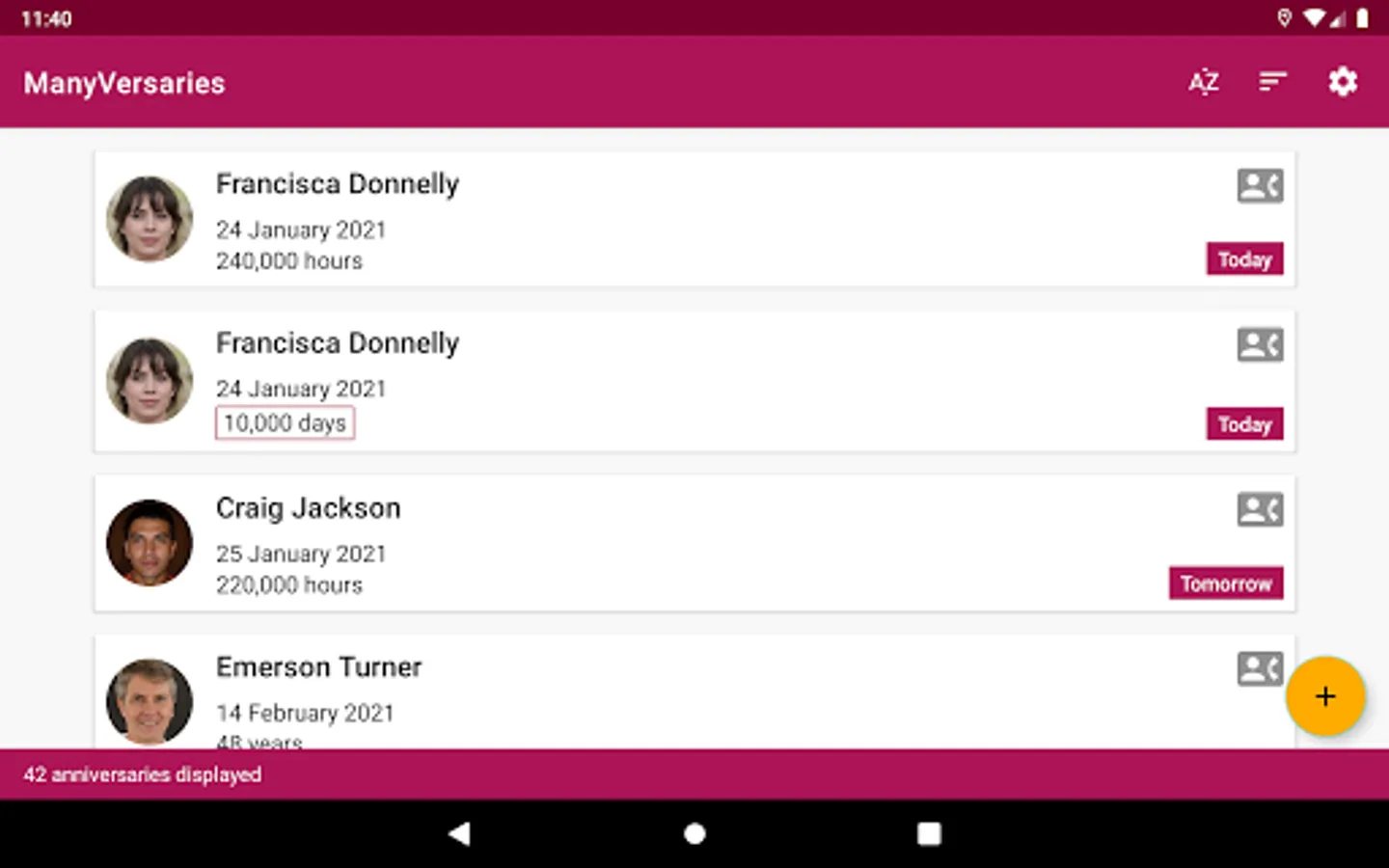 ManyVersaries search in your contacts list those with a date of birth. It then displays a list with the next anniversaries to wish. The list displays the names and pictures of your contacts. It is very easy to go from this list to the contact screen to contact them and wish them their birthday.