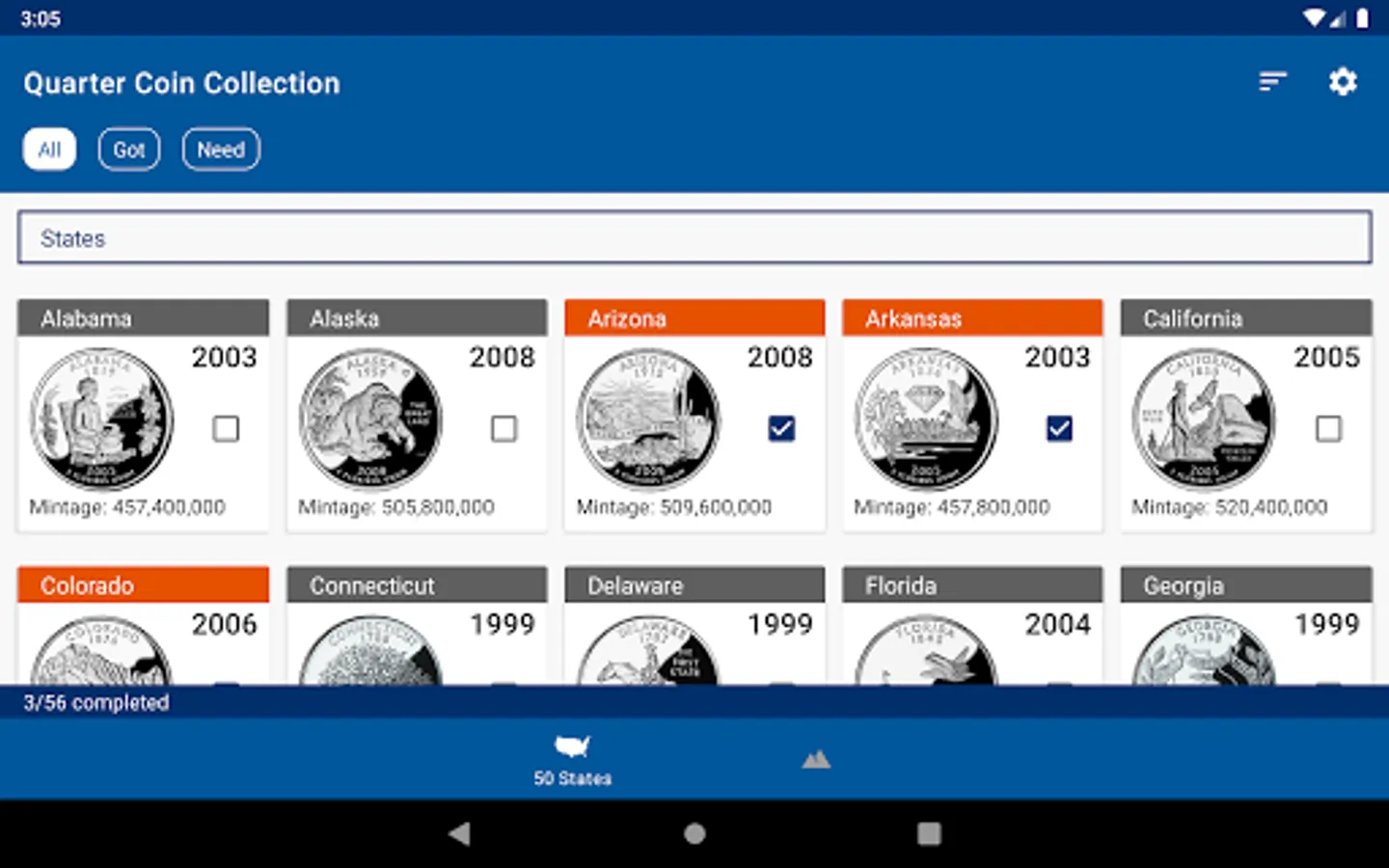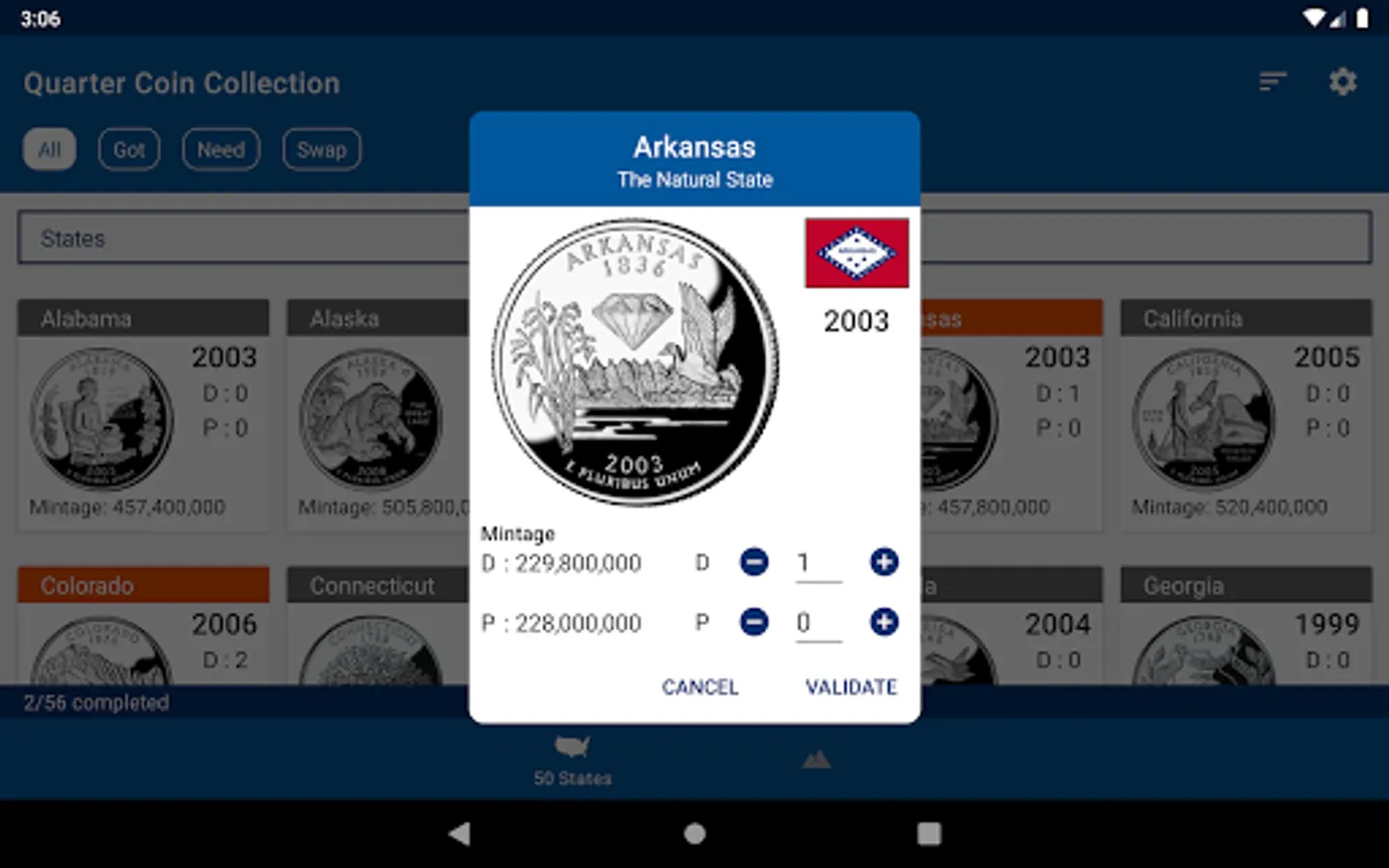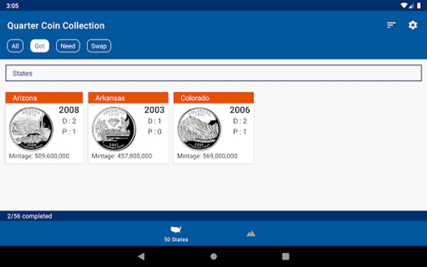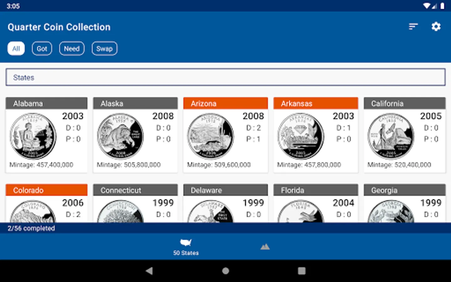 Quarter coin collection allows you to manage your collection of US quarter dollar coins from the "50 states" and "America the Beautiful" series.
