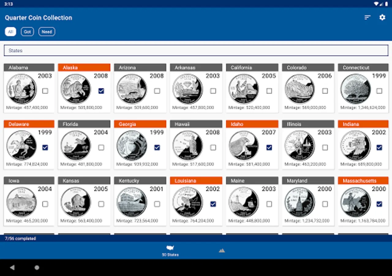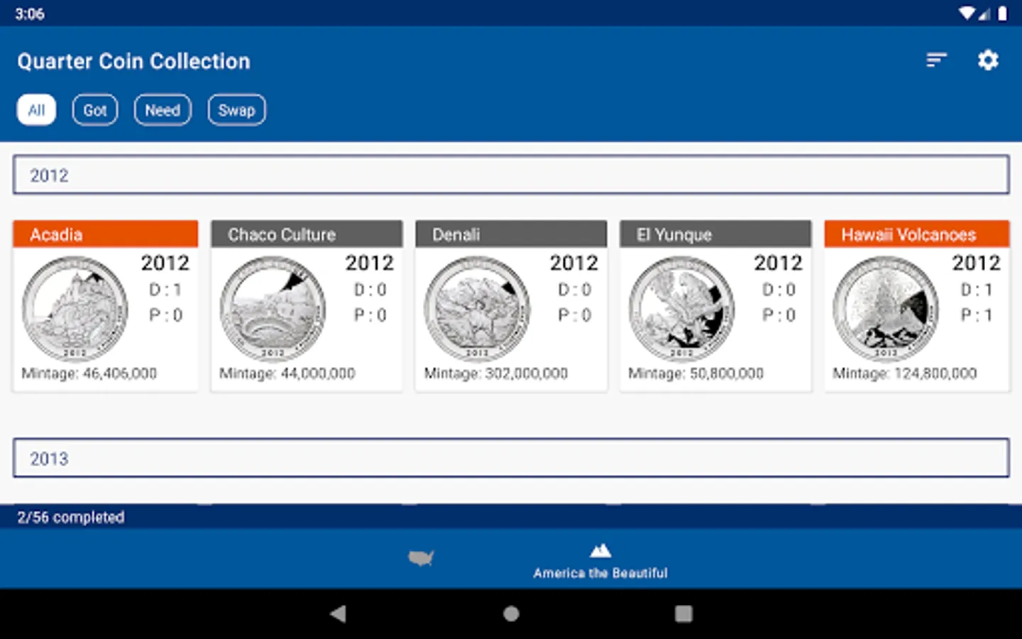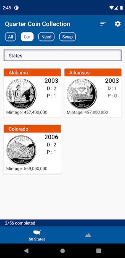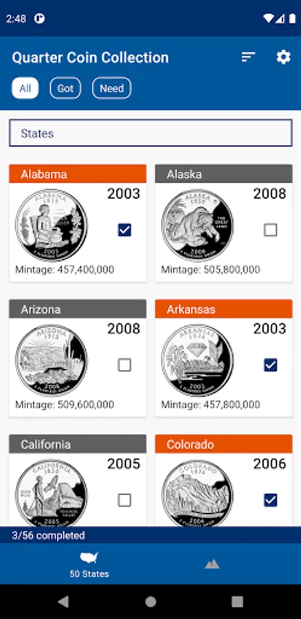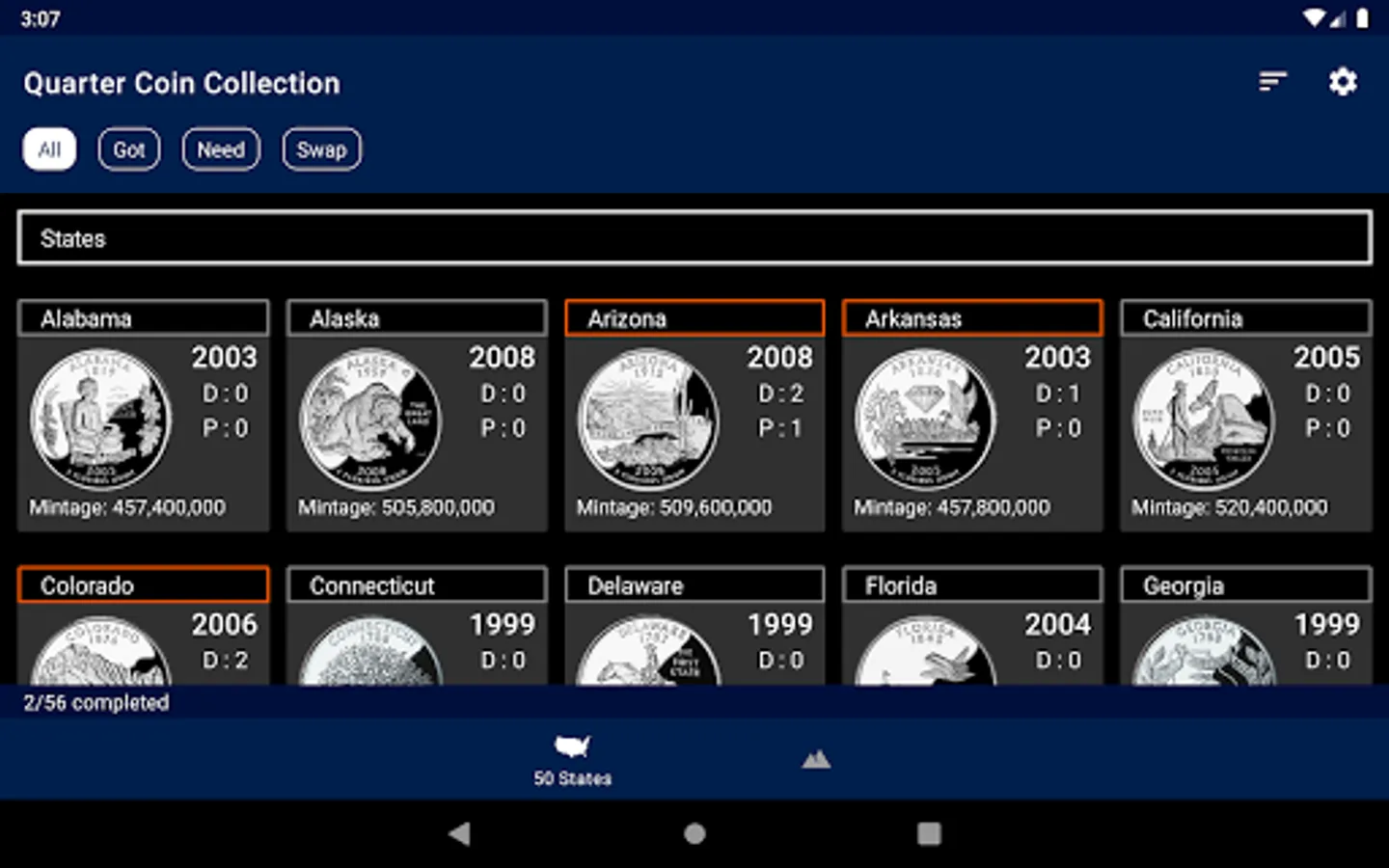 Quarter coin collection allows you to manage your collection of US quarter dollar coins from the "50 states" and "America the Beautiful" series.