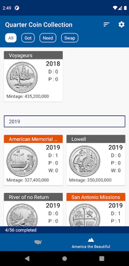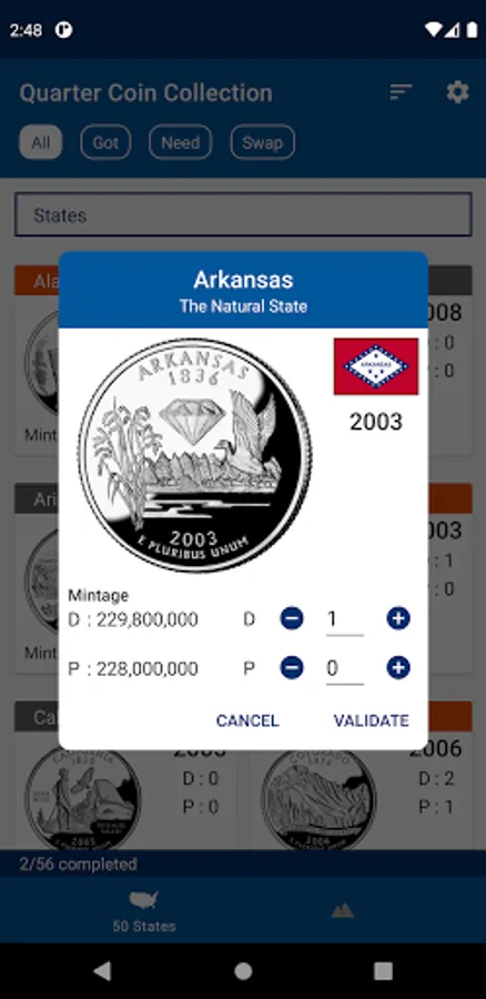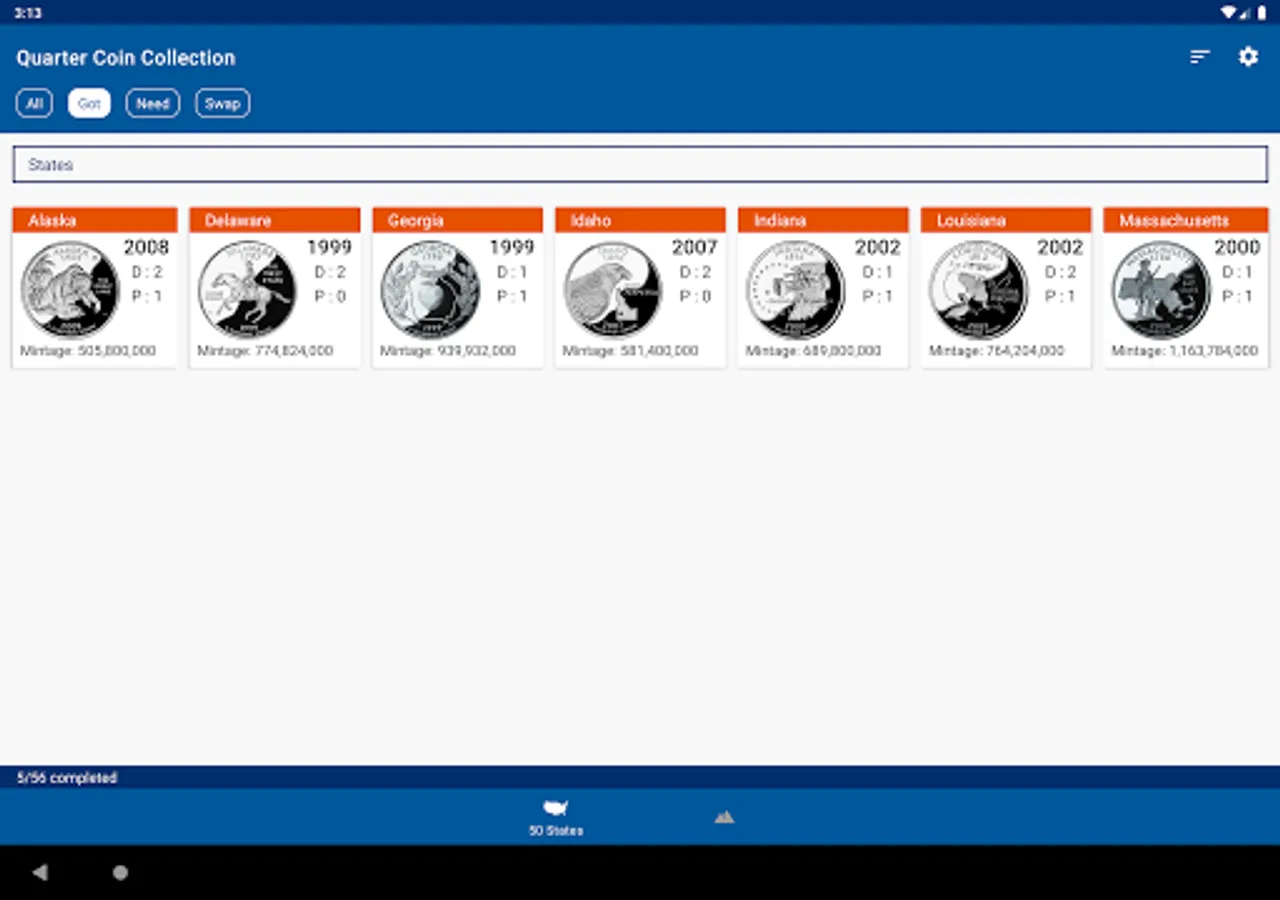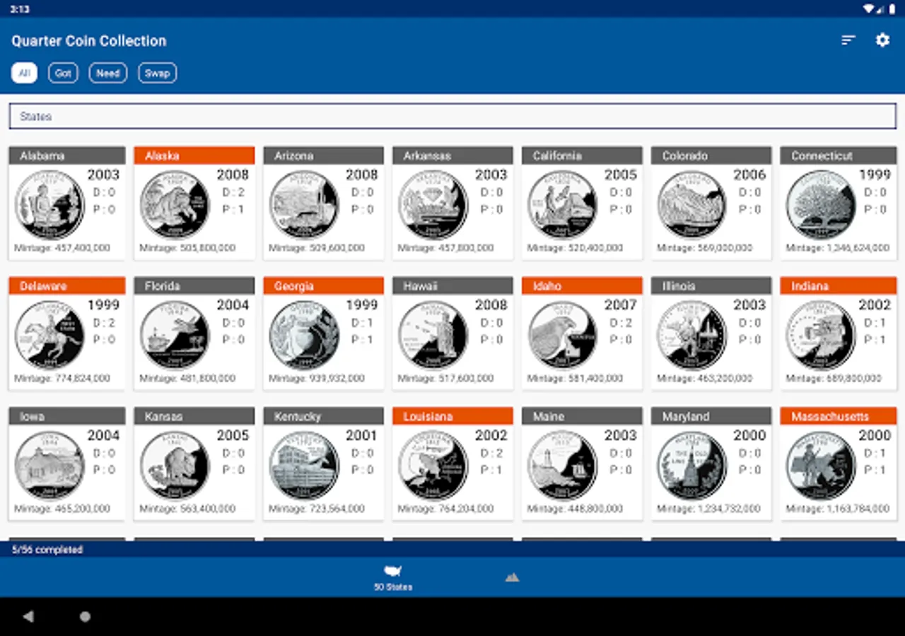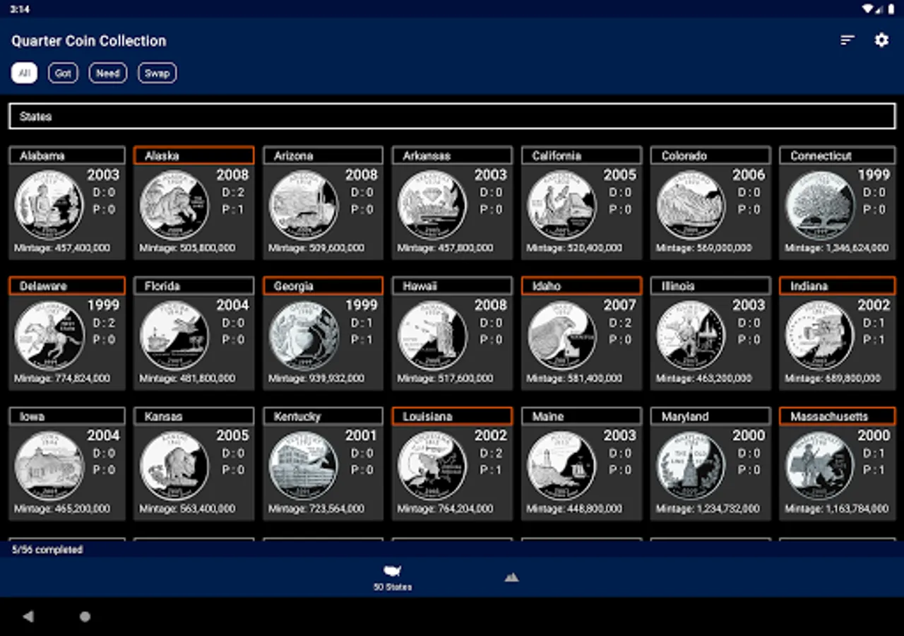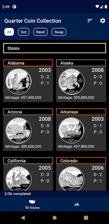 Quarter coin collection allows you to manage your collection of US quarter dollar coins from the "50 states" and "America the Beautiful" series.